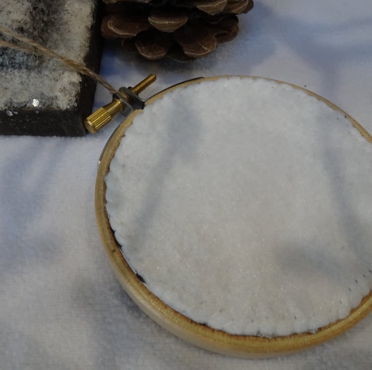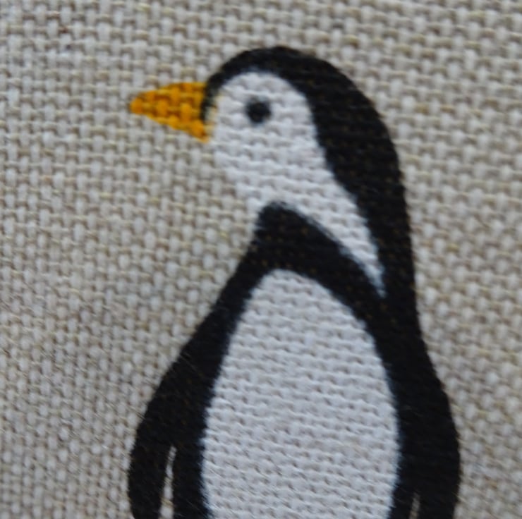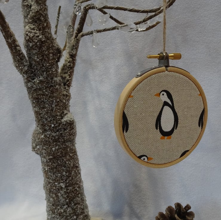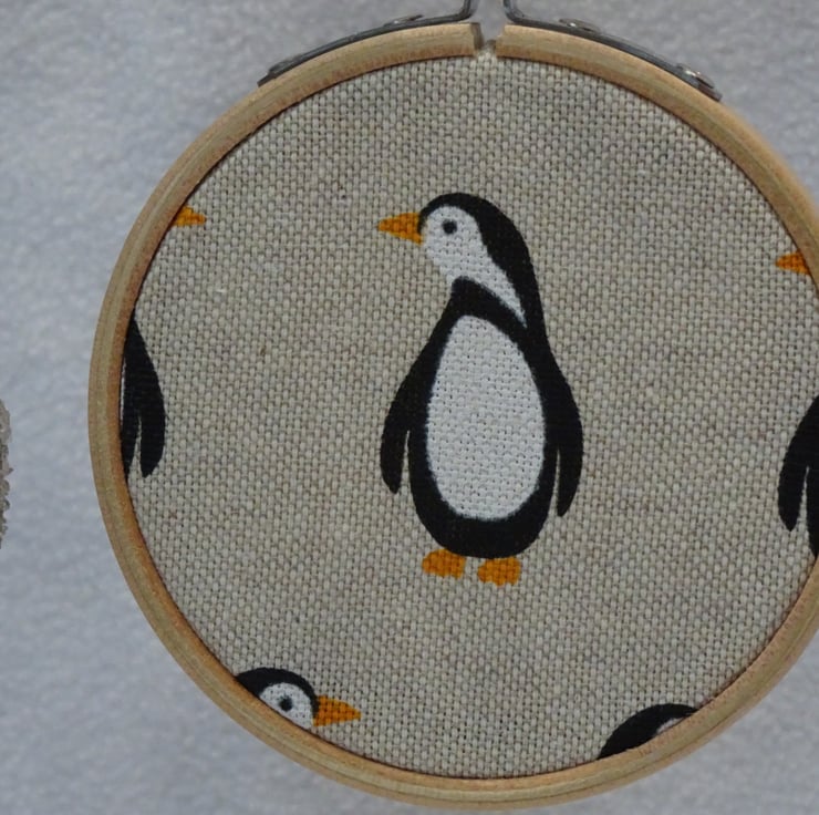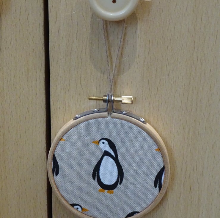 A mini hanging decoration with a cute black and white penguin print on linen cotton fabric. The wooden hoop measures approximately 3.2 inches (8.3cm) across once finished and is hung with a length of twine approx 3.7 inches (9.5cm).