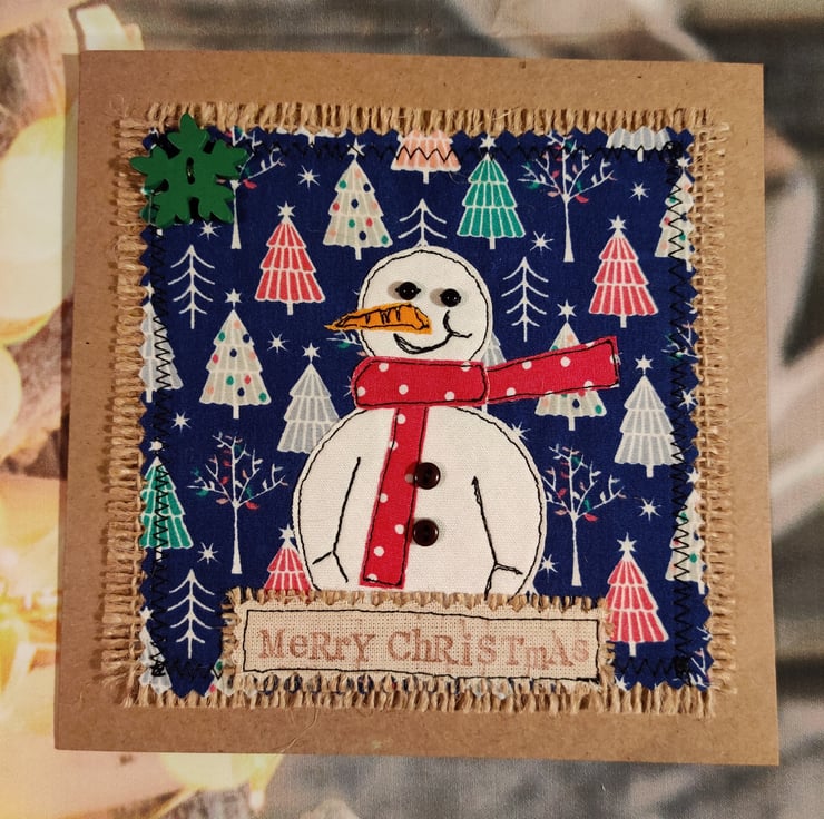 Unique, handmade appliquéd fabric Snowmen Christmas cards