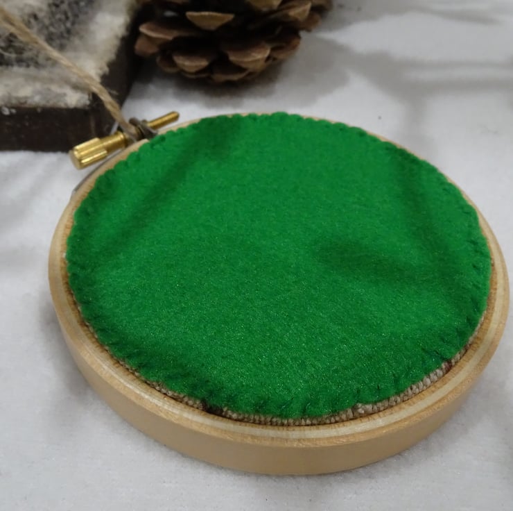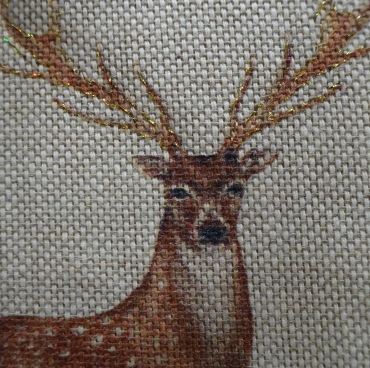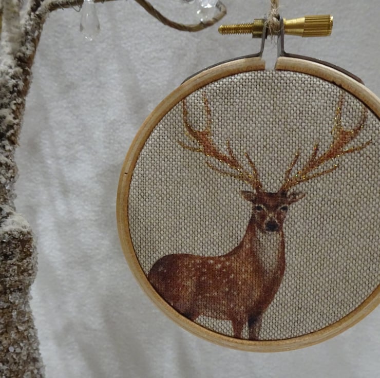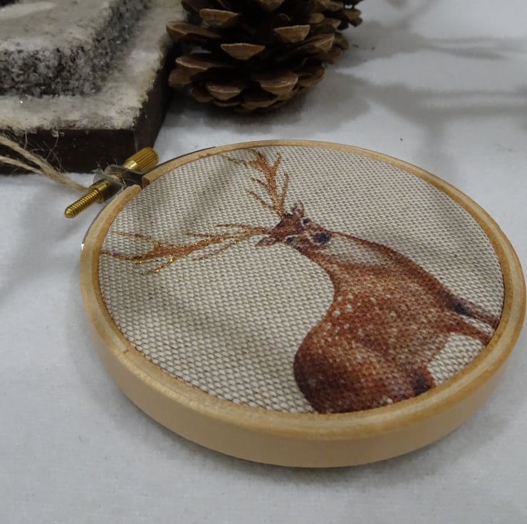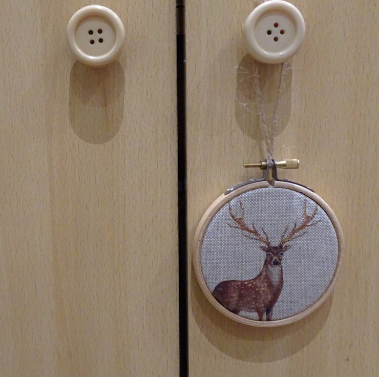 A mini hanging decoration with a beautiful stag print on linen cotton fabric. The antlers have had hand stitching with a gold thread added so that they glint in the light. The wooden hoop measures approximately 3.2 inches (8.3cm) across once finished and is hung with a length of twine approx 3.7 inches (9.5cm).