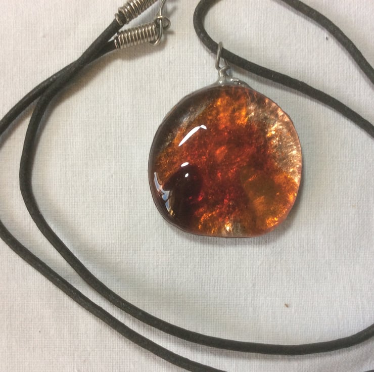 This fused glass orange and red coloured translucent pendant is reminiscent of looking into the flames of a fire by layers of red and orange glass being laid over each other . It has a reflective backing, which contains some lead, giving the colours more vibrancy and it looks good over skin or any colour of clothing. It is about 5cm diameter, comes with a thong and clasp and is gift wrapped. I may be able to charge less postage for a second item ordered if it is the same size or smaller than this item