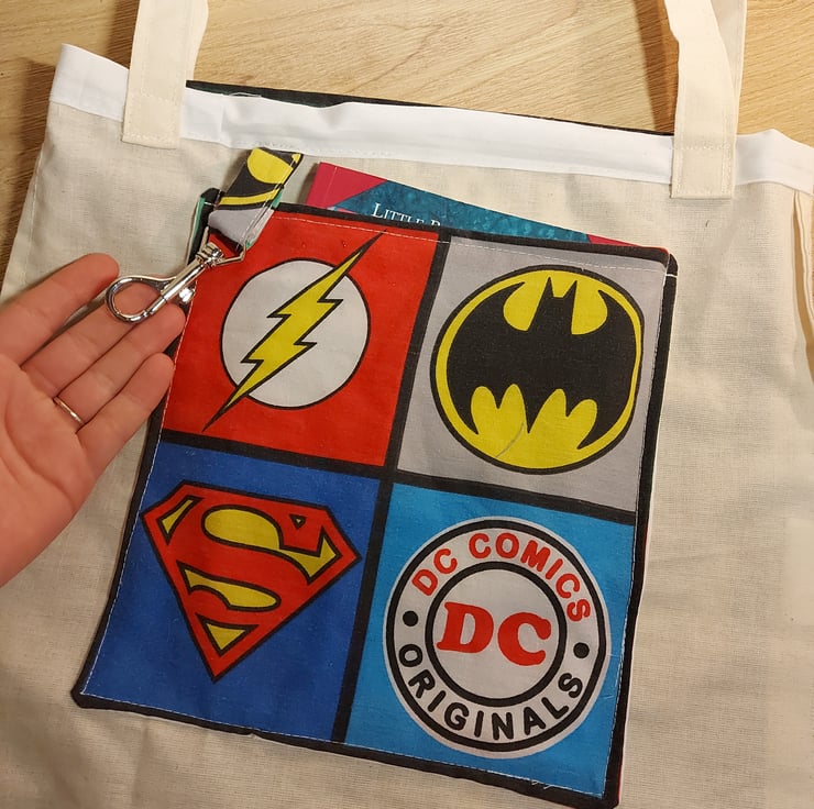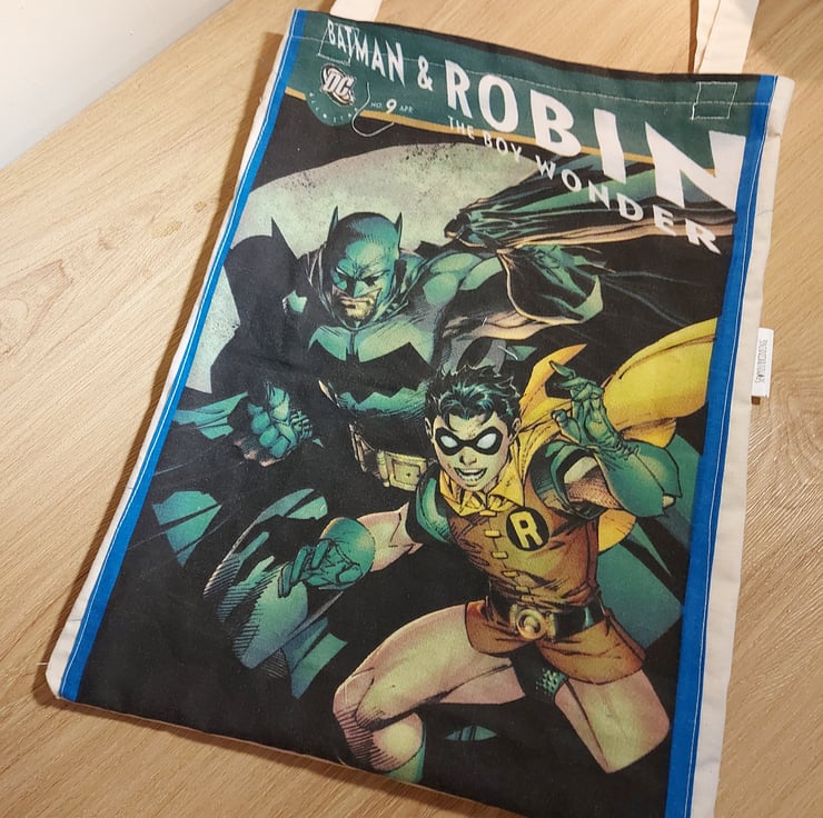 This is a one of a kind batman and robin tote bag inside is a coordinating pocket that has a few of the logos of other dc heroes along side