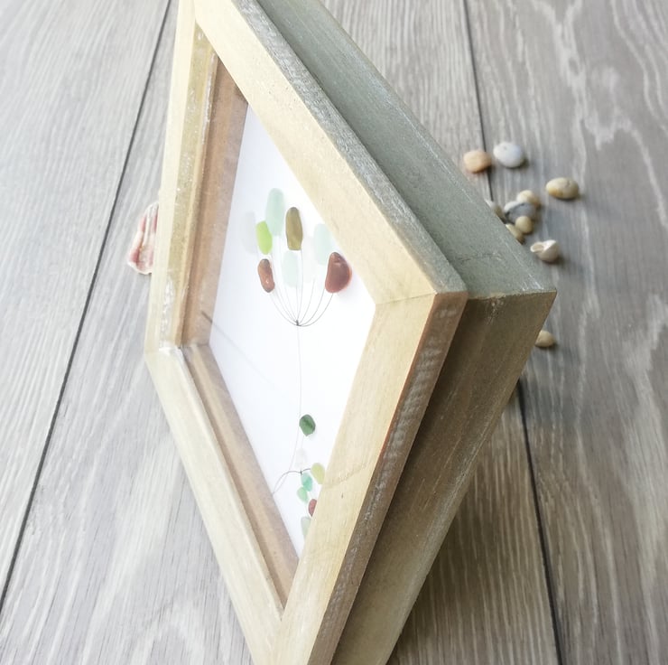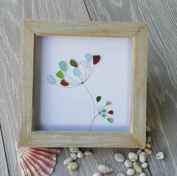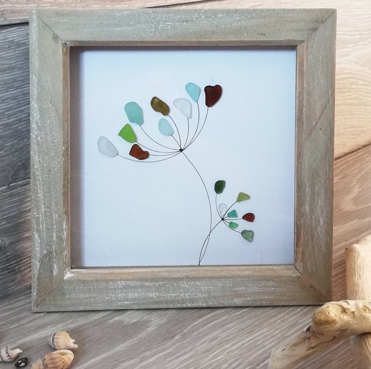 This natural coloured frame measures 7in x 7in. With different colours of white, greens, turquoise and brown coloured seaglass all collected from my local beaches, making two flower heads. One large flower and one smaller flower. Very simple and delicate looking flowers, yet very effective. Would be an ideal picture for any room,