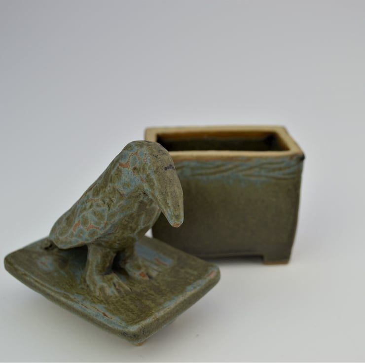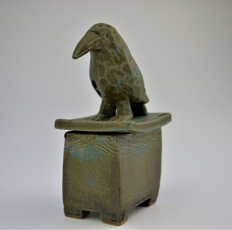 Each box has been constructed from slabs, then a crow modelled and carved on top. I don’t use templates so each one is different in its dimensions and really, who has seen identical birds? The carving used on the crows adds to the differences in the finish of the glazes. Glaze pools in the carved areas and I gently wipe the surface to add to the contrast.