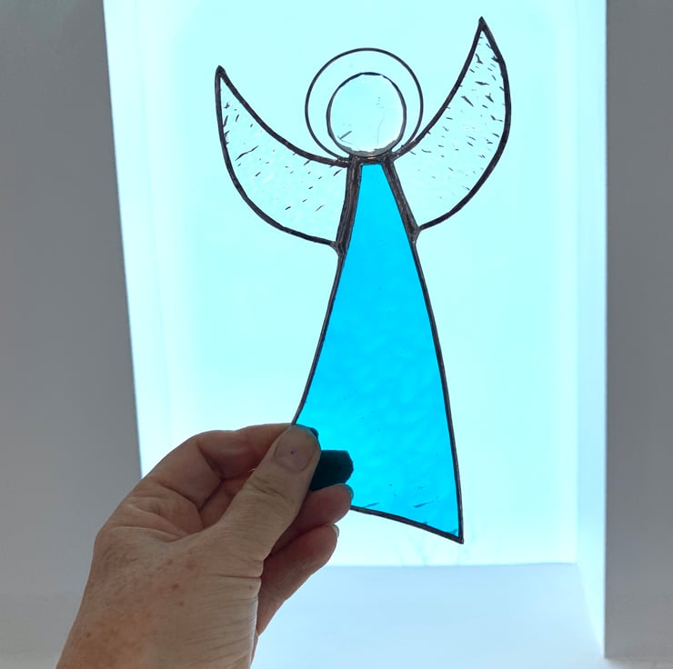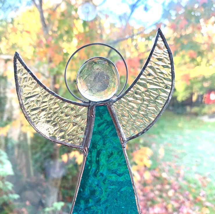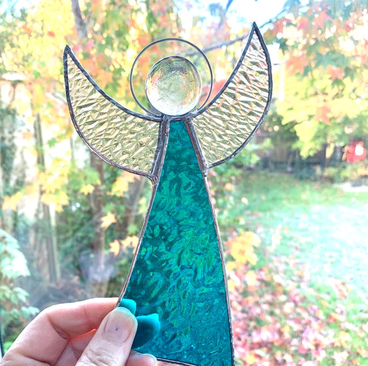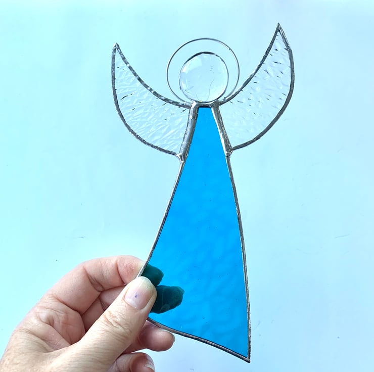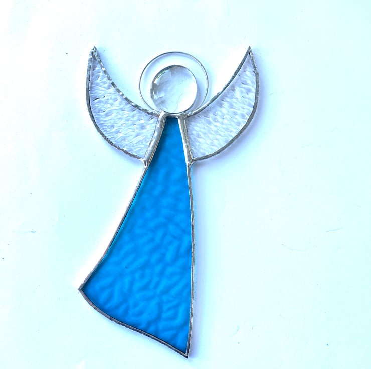 This angel has been made from turquoise muffle glass for the body and clear ice crystal glass has been used for the wings. A large glob has been used for the head and wire for the halo.