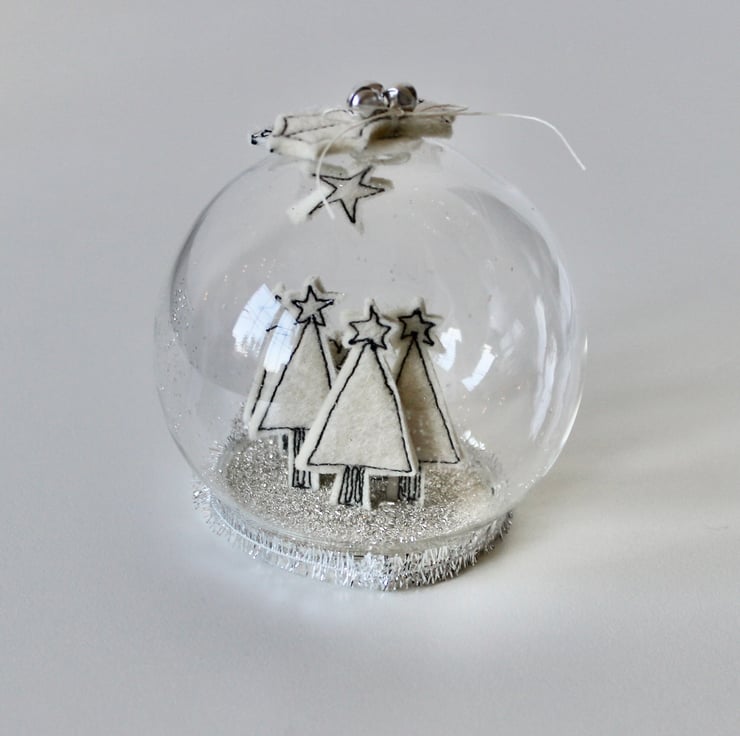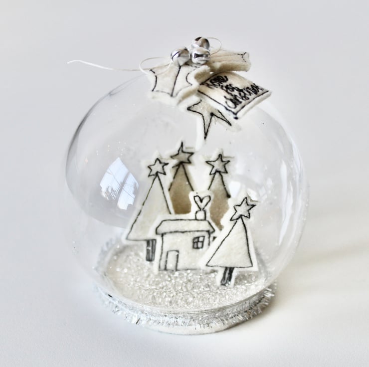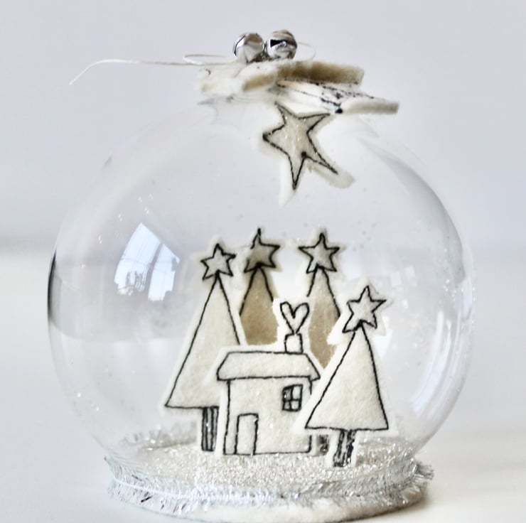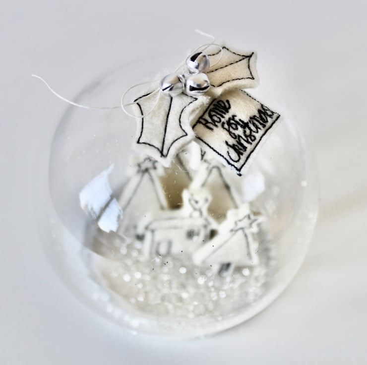'Home for Christmas' is created using free hand machine embroidery and 100% wool felt. The festive scene is encapsulated within a glass dome, with vintage glass glitter snow (not real, sorry), a star, silver coloured bells, two holly leaves and a sewn sign 'Home for Christmas'. Delicate tinsel finishes of this delightful Christmas decoration.