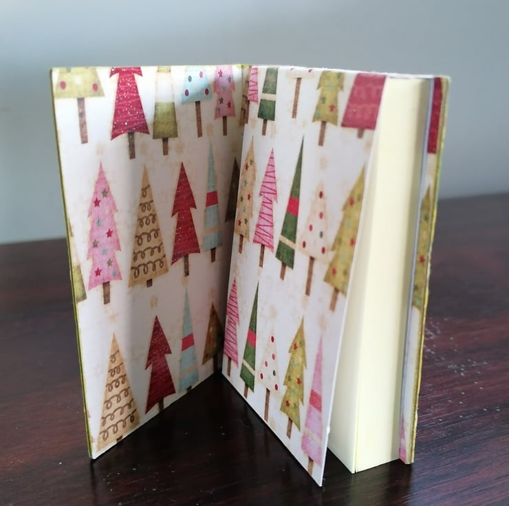 Inside is an adhesive notebook (76x51mm) of 100 pages finished with a glittered christmas tree paper cover.