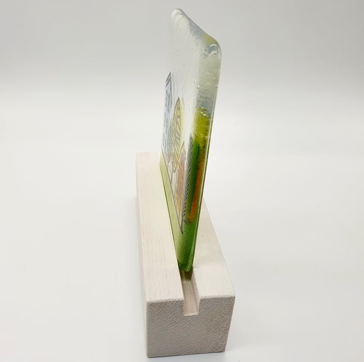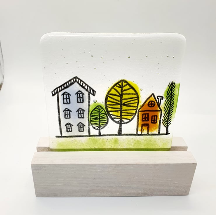 This quirky fused glass tile features a screen printed street which has been coloured in with glass powders to create this charming scene.