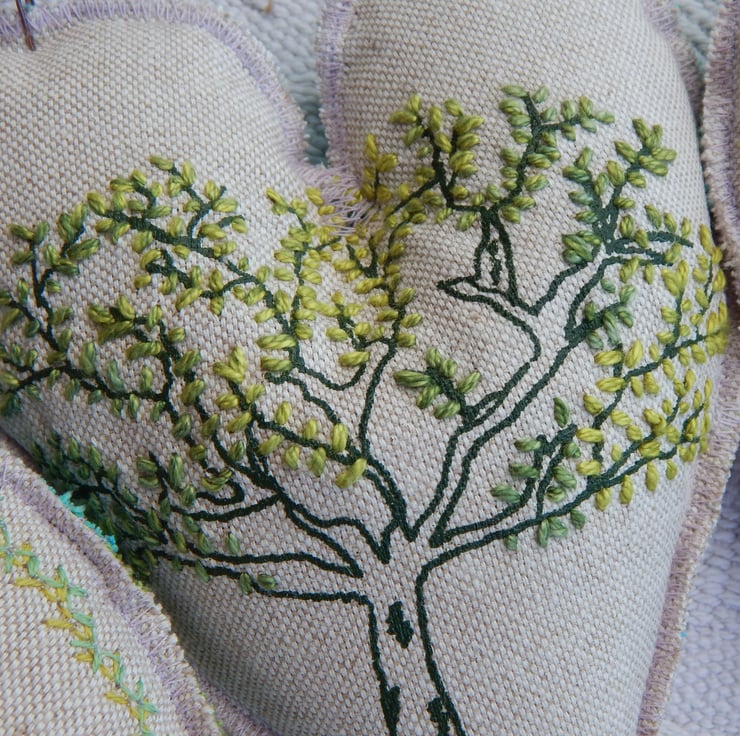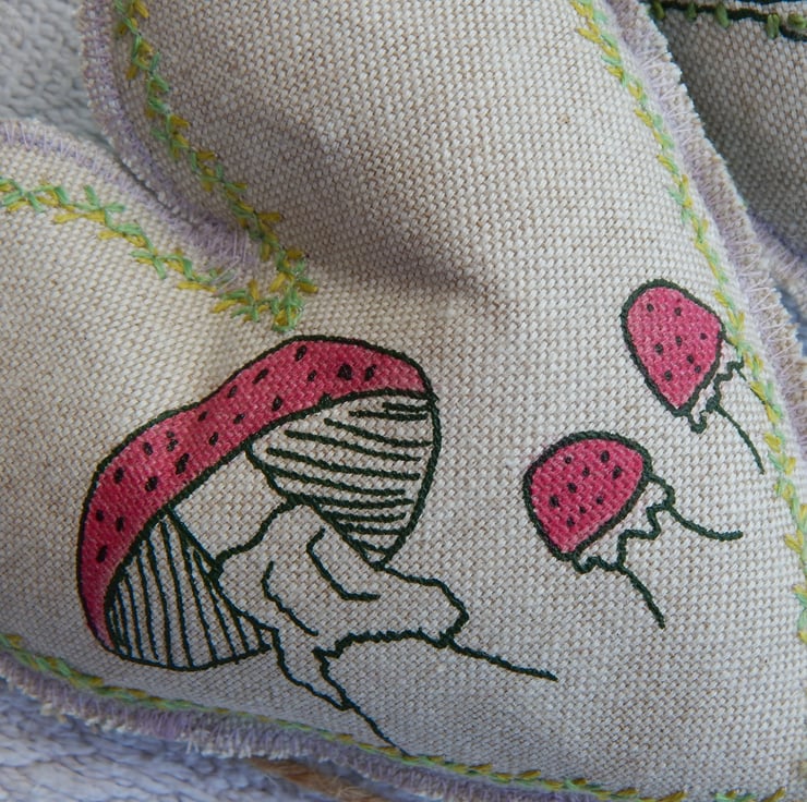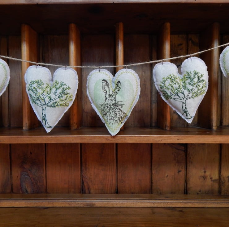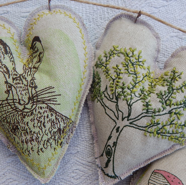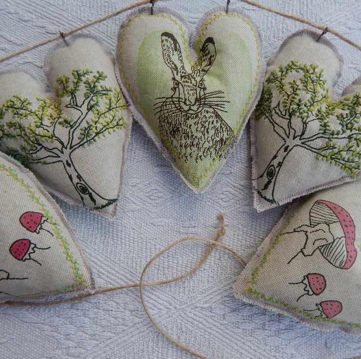 There are 5 hearts measuring approximately 14cm by 12cm. There is a central hare screen printed onto a simple lino print of green, with decorative stitching to the edge. There are 2 red toadstools screen printed with decorative green stitching to the edge. The final 2 are screen printed oak trees that have their leaves hand embroidered on.