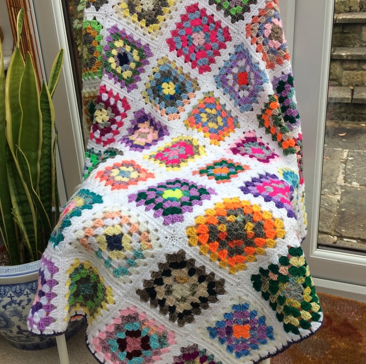 This lovely granny square blanket is made from all acrylic wool, colourful and warm, it is stitched very carefully and has my signature 70's edge in purple... It is 42" x42".