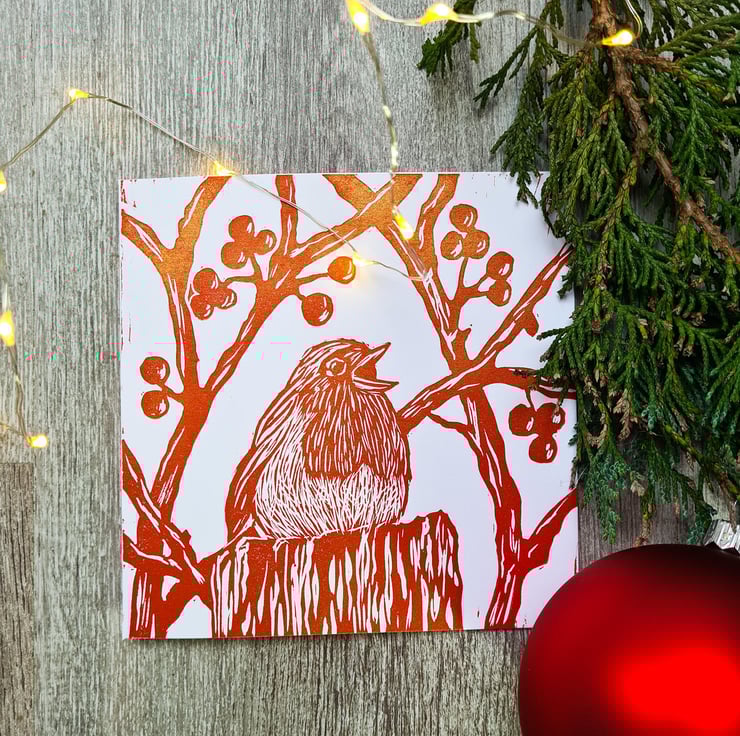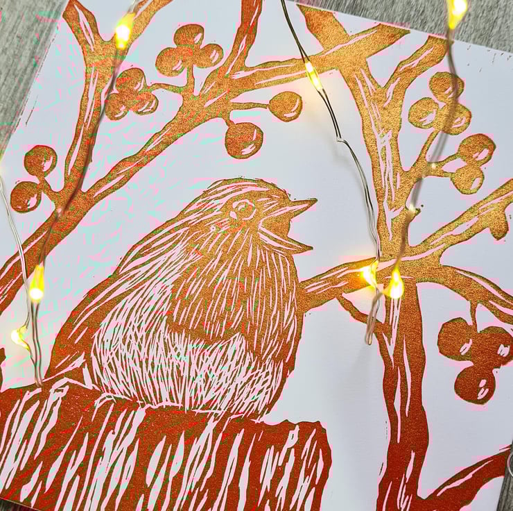 This hand printed Christmas card features a lovely, singing Robin sitting amongst berries and branches. It's a vibrant red colour with iridescent gold shimmer which catches the light beautifully. we all love a bit of sparkle at Christmas!