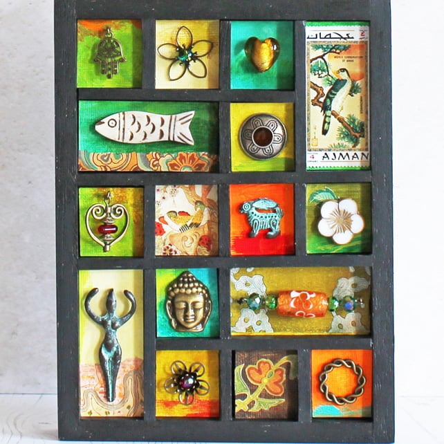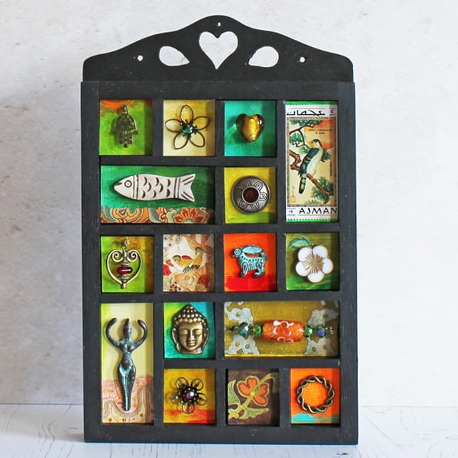 The artwork is displayed in a pretty thimble rack which has been given a coat of black acrylic paint. Layers of paint and paper collage have been used to create colourful backgrounds to each section.