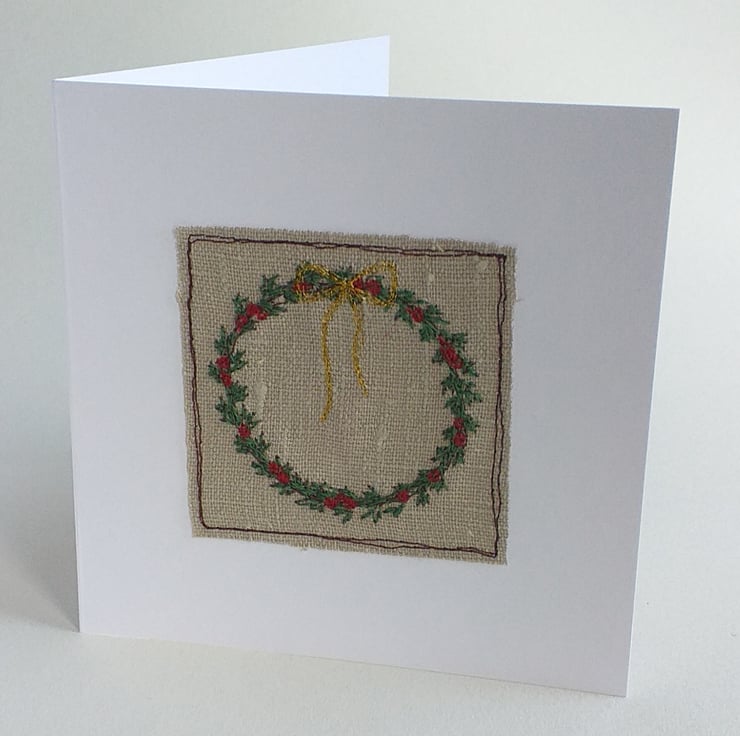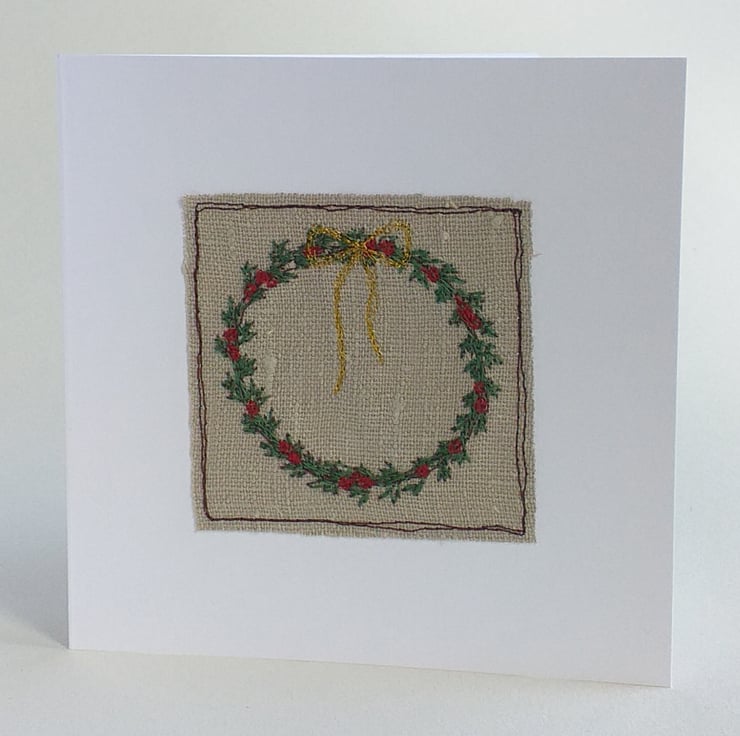 This lovely Christmas card features a wreath embroidered on linen in different coloured threads, with a beautiful gold bow and red berries.