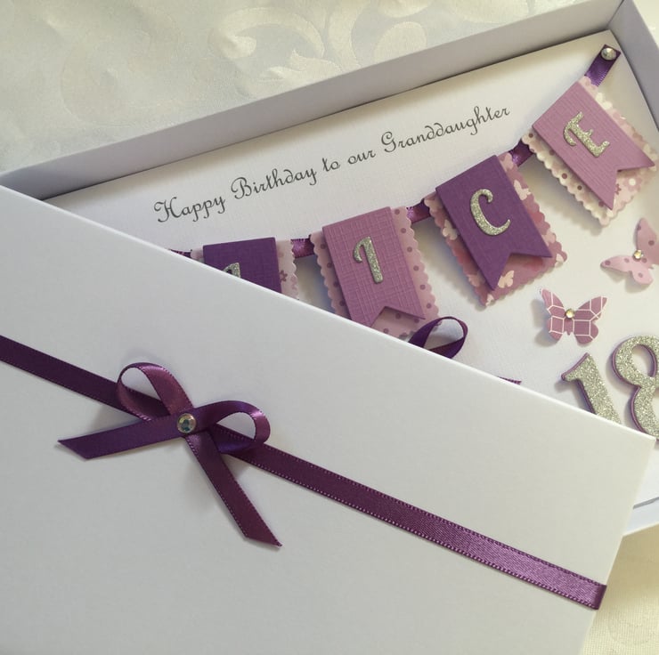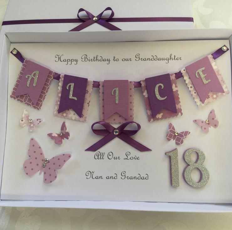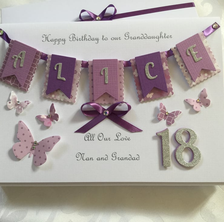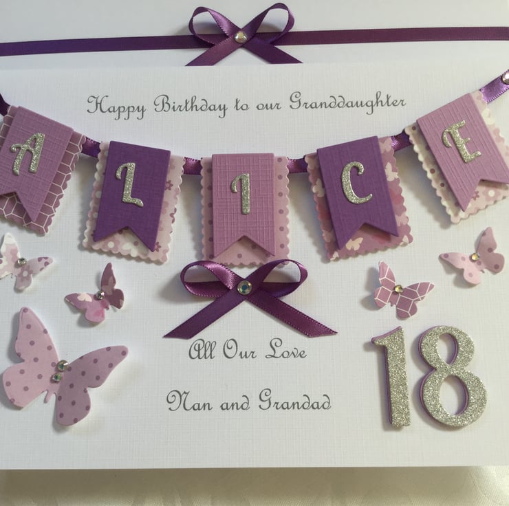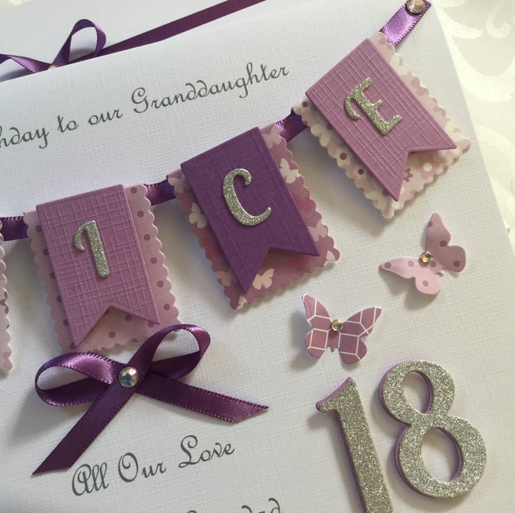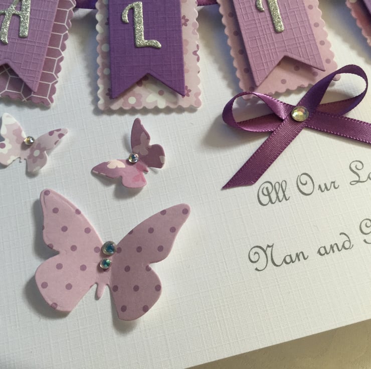This handmade personalised card is A5 in size ( 210mm x 150mm) and is on 300gsm heavyweight linen cardstock. A name of up to seven letters can be made on the bunting. This card can be for any birthday or special occasion. Any text can be added above and below the bunting. Any age can be put on the card.