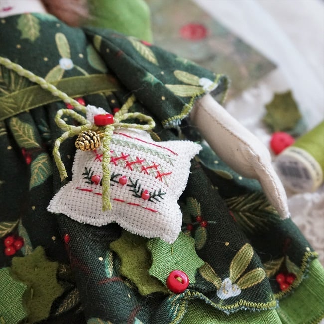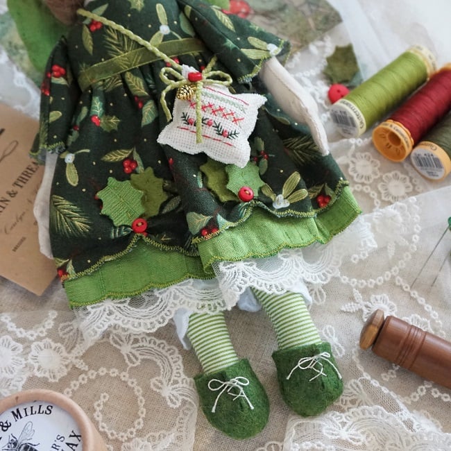 This is Berry. A new smaller pattern, she is about two thirds the size of my witch. This little Holly Fairy has a ditsy print dress in creen with a multitude of leaves and berries dotted about, a silk petticoat with lace slip and knickers. She has silk wings and sports a little sampler. Her shoes are the smallest I have ever made and are felt. She has a rose quartz crystal to her heart with lavender in her stuffing and is finished with tiny buttons, organza ribbon and holly leaves to her hair and dress. Just loved making her xx