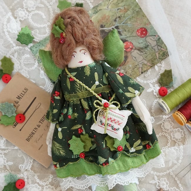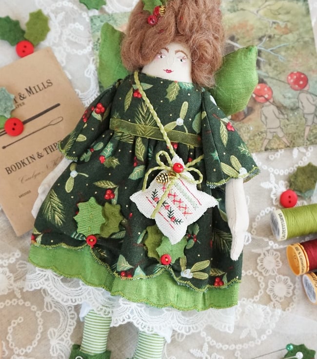 I wanted to make a fairy for a while but a more experienced fae not a teenage waif. This little holly fairy will hang nicely on your tree or decorate a wall, a tiny festive spirit. xx