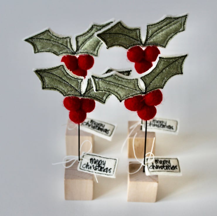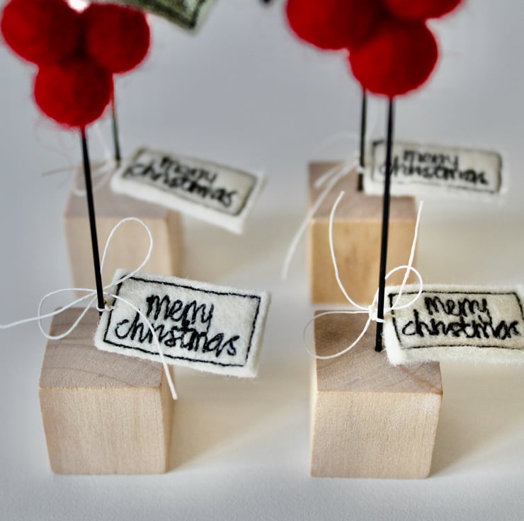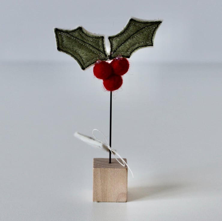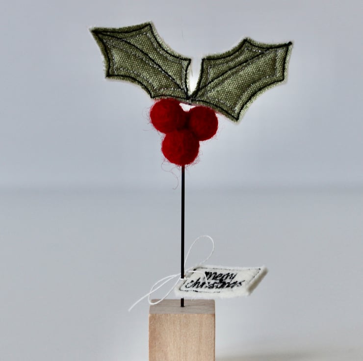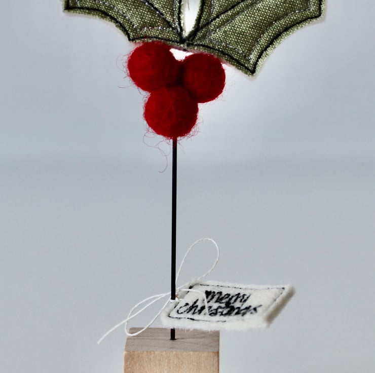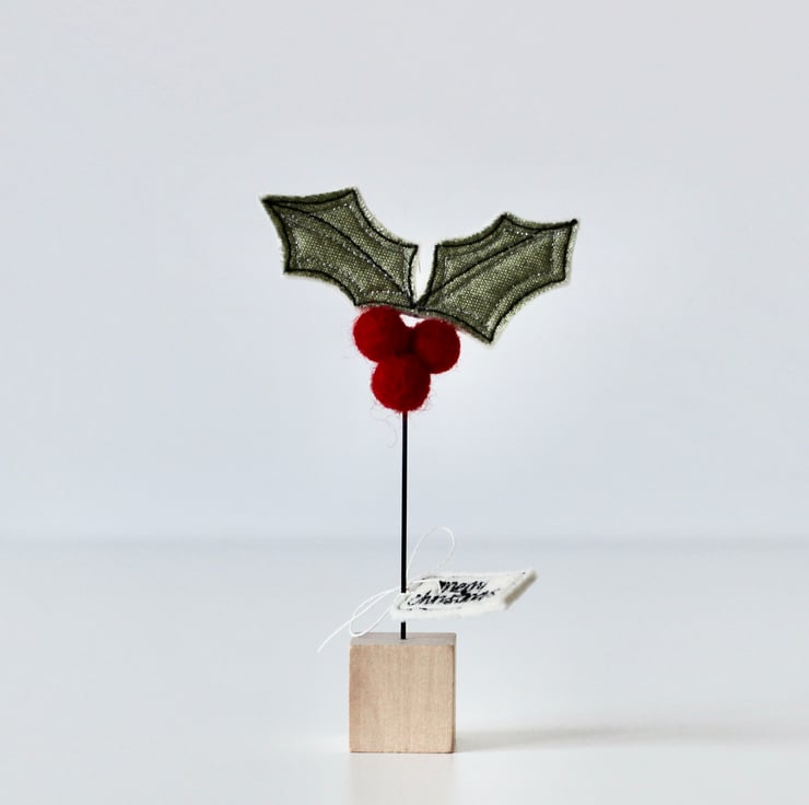 Holly is created using 100% wool felt, cotton cloth, free hand machine embroidery and is cut out by hand using very sharp scissors. Red wool felt balls make perfect berries, a sewn label 'merry christmas' is attached using linen thread and it is mounted on a 2cm cube wooden block. The perfect decoration to adorn a mantle piece or any flat surface.