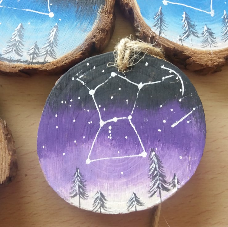 A handpainted wood slice depicting the constellation Orion in a starry night sky.