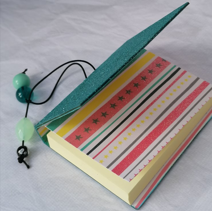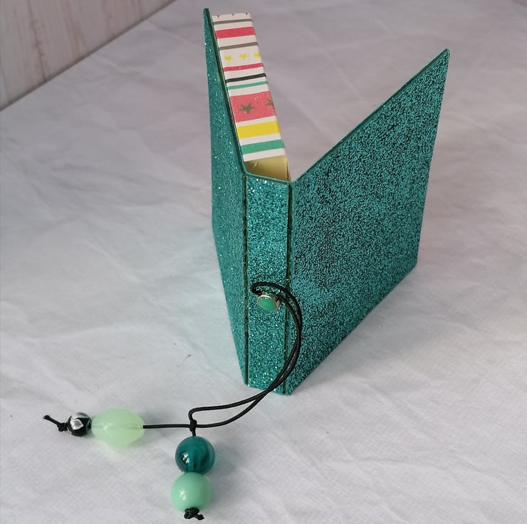 The covers are made from upcycled packaging covered in decorative glitter or floral paper. They are held closed with an elastic fastening. Each one is embellished with a small charm.
