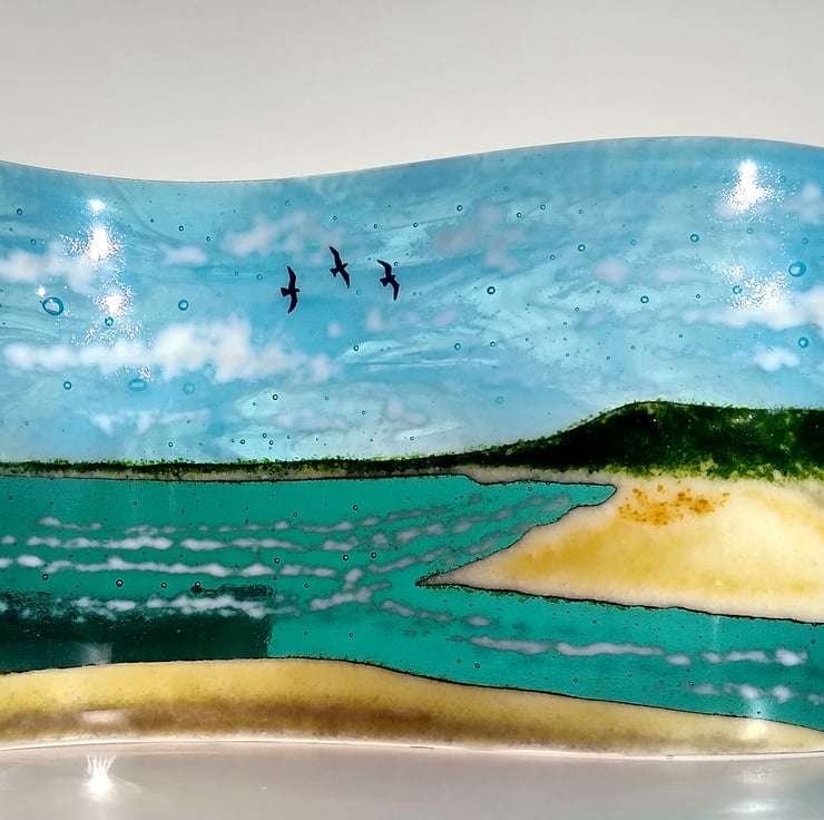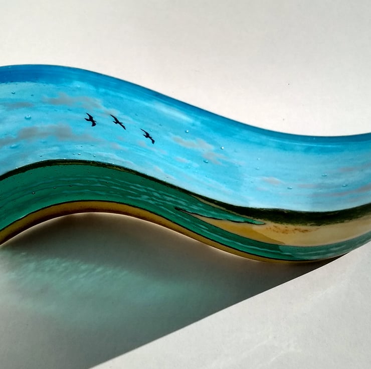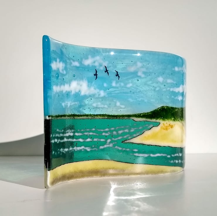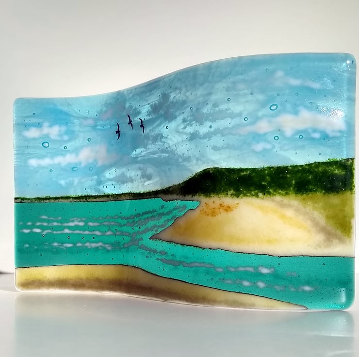 This made to order freestanding fused glass From Ogmore to Merthyr Mawr wave is my interpretation of the scene of the Ogmore estuary on the Glamorgan Heritage, looking across to Merthyr Mawr sand dunes and Porthcawl. No seaside scene would be complete without seagulls so I have hand-painted a few to add an element of life.