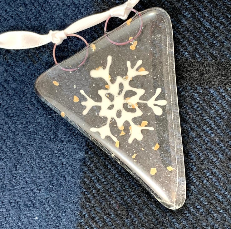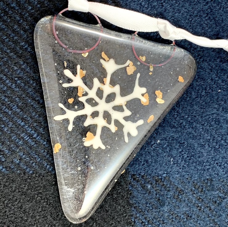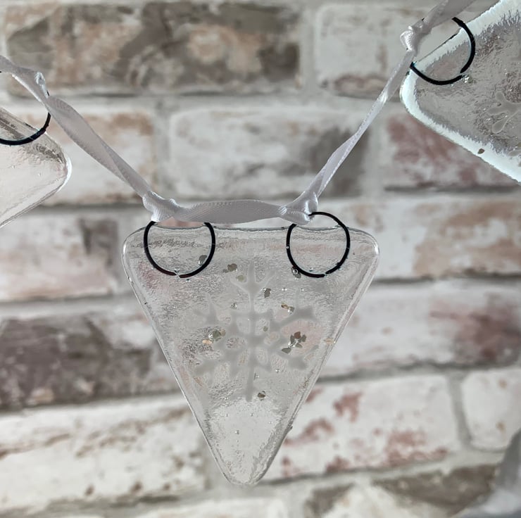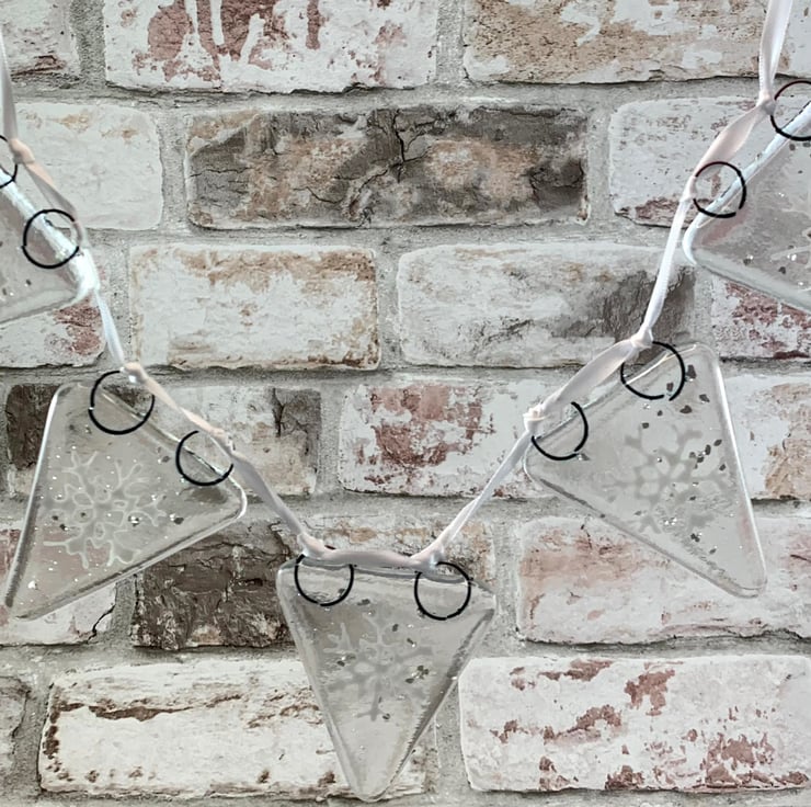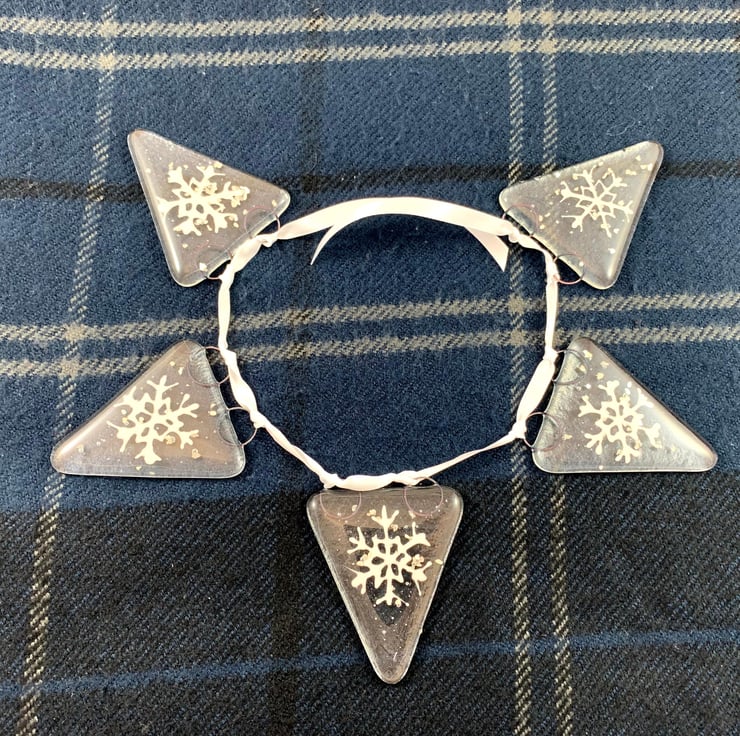 Our fused glass bunting consists of 5 flags, each featuring a hand drawn snowflake design that is fused to the surface of the glass, there are gold coloured flakes fused behind this between another layer of glass. They are strung on to quality red ribbon.