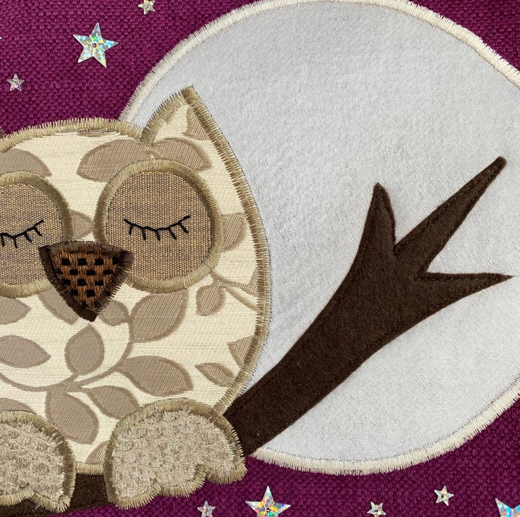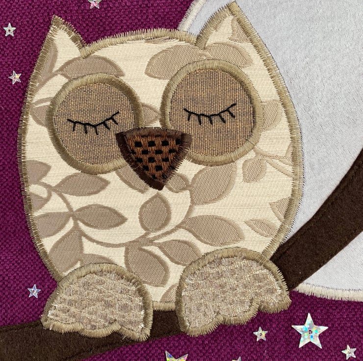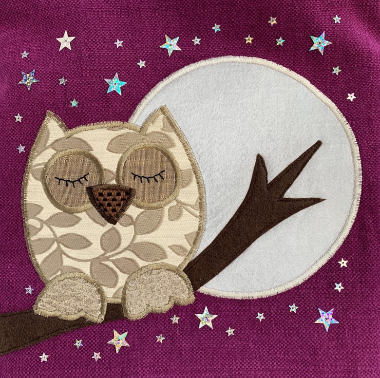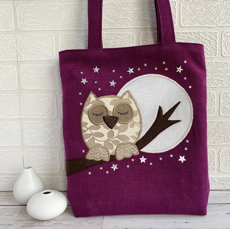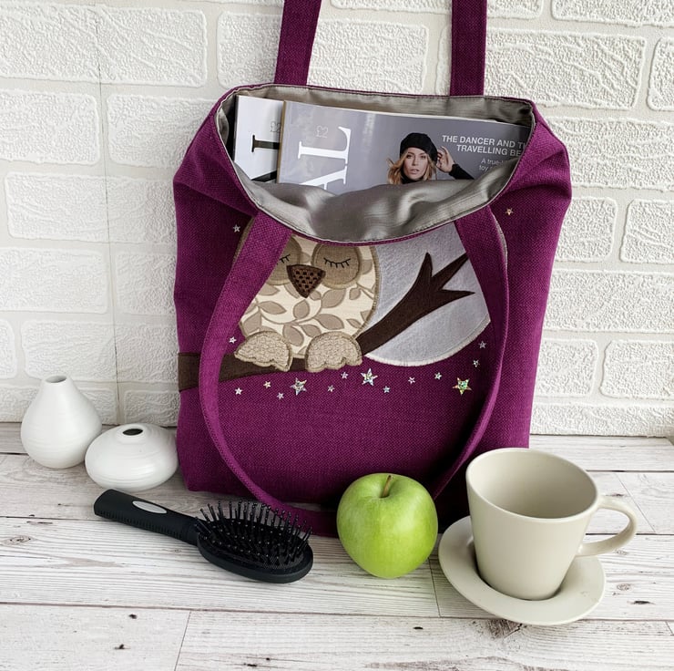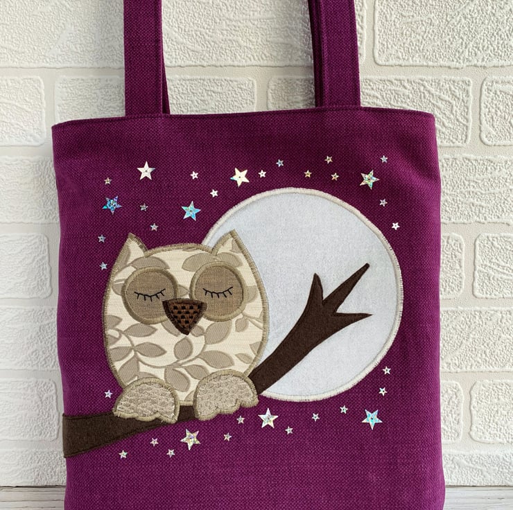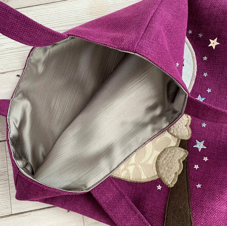 A purple tote bag with a sleepy owl and full moon. This tote bag is made from lovely vivid purple fabric and has an appliqué design depicting an owl sleeping on a branch under a starry sky with a full moon. The owl is made from cream fabric with a beige woven leafy pattern. He has beige textured feet, a brown and black checked beak, and beige eyes to which I've added hand-embroidered black sleepy eyelashes. The branch is made from brown felt. The large full moon is made from silver satin. I've added lots of silver holographic star-shaped sequins in two sizes. The bag is lined with grey satin fabric.