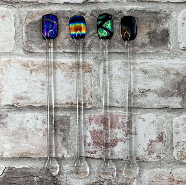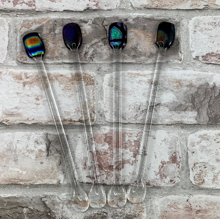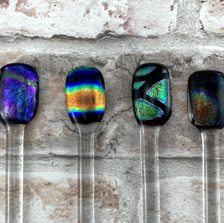 This set of four handmade cocktail stirrers / swizzle sticks feature a dichroic glass top that shimmers as the light catches it. They are great to give as a gift and can be used as drinks markers. They are sure to add a touch of sparkle to any party.