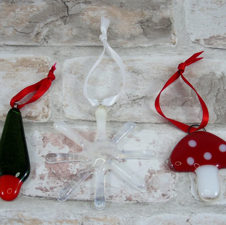 Mini Toadstool, Mini Christmas Tree and a Snowflake, perfect to give as a gift or for your own tree. These can be posted out direct to your loved ones with a note include.