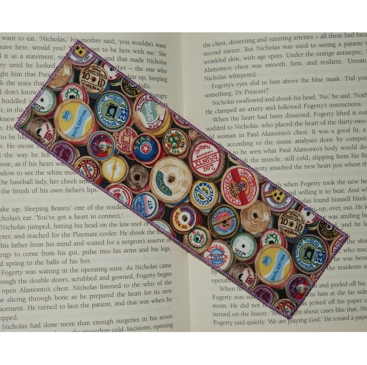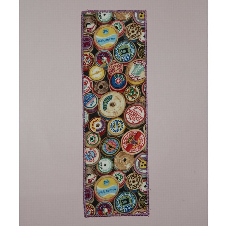 A bookmark for sewing lovers it measures 2.5 x 8 inches and is made from fabric featuring vintage looking cotton reels. The edge is stitched in purple thread. It would be ideal to keep your place in a sewing book, or your favourite novel.