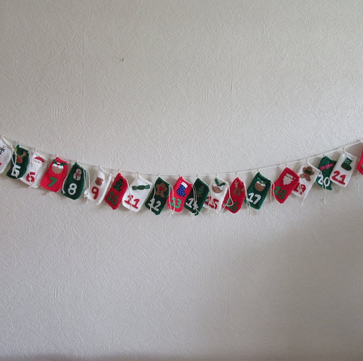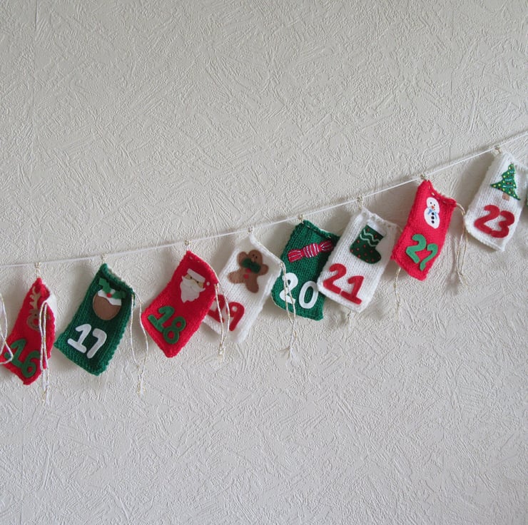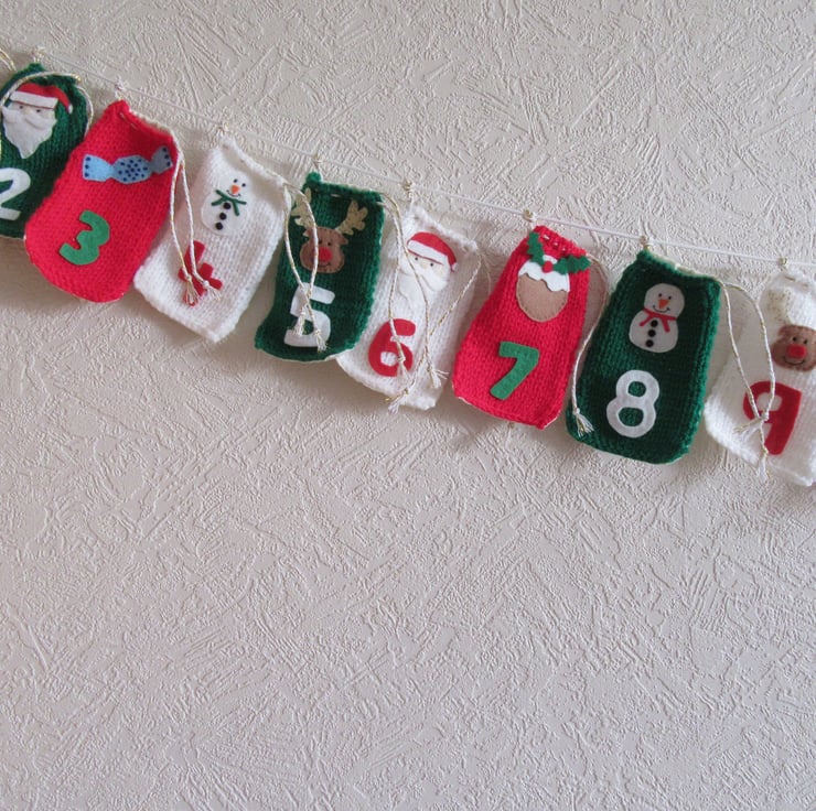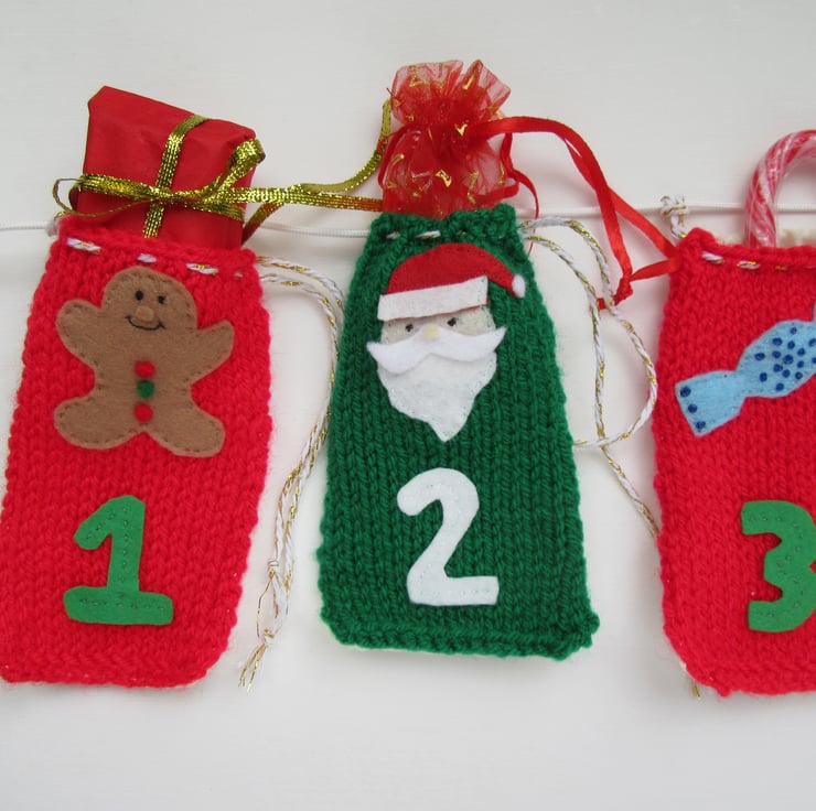 Handmade advent calendar that can be reused year after year. A fun and personal way to countdown to Christmas with 24 hand knitted Santa style sacks, which are strung along strong white cord and can be moved along the length to fill the space you have.