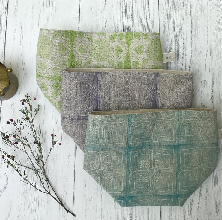 I hand carve my unique designs on to lino blocks then hand print on to fabric woven locally in Fife. I mix the Eco-Friendly water-based inks in small batches, therefore there may be a variation in colour between subsequent batches