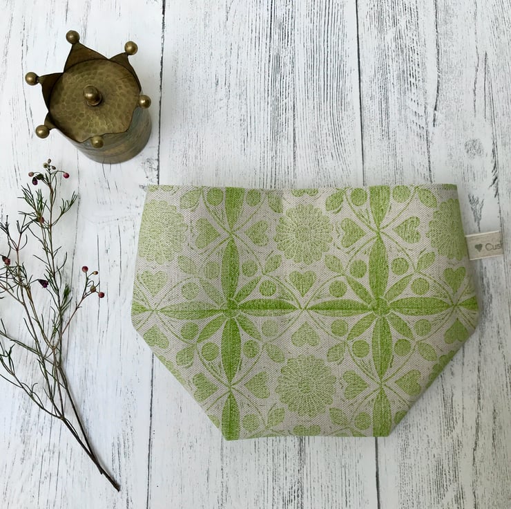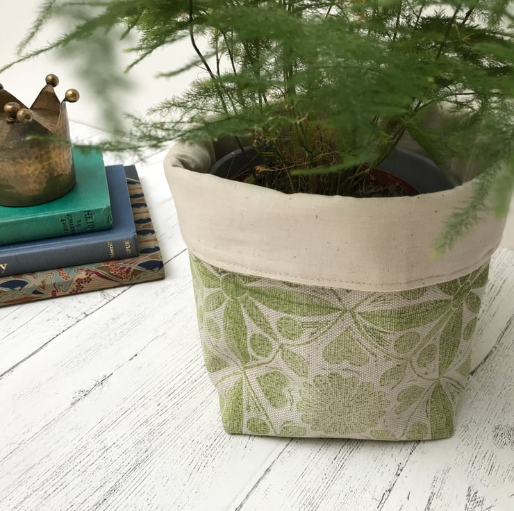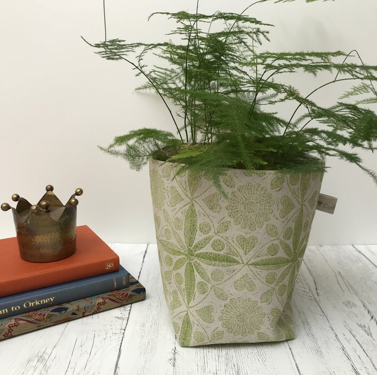 This unique design is block printed by hand using Eco-Friendly inks on to natural linen union fabric woven in Scotland. The lining is 100% cotton calico. The top can be folded down or left standing up for more storage