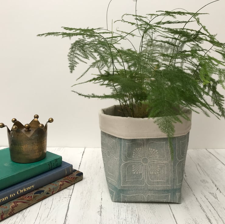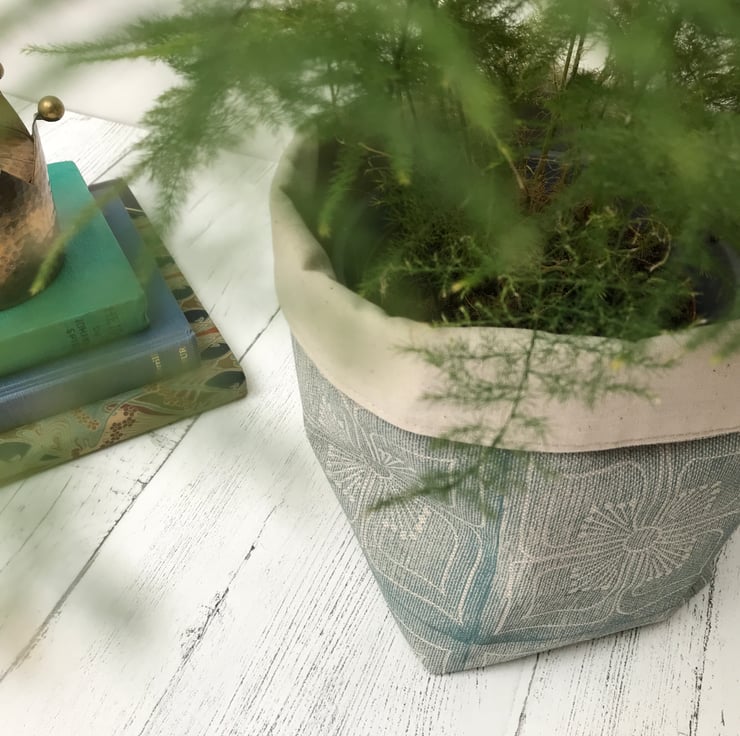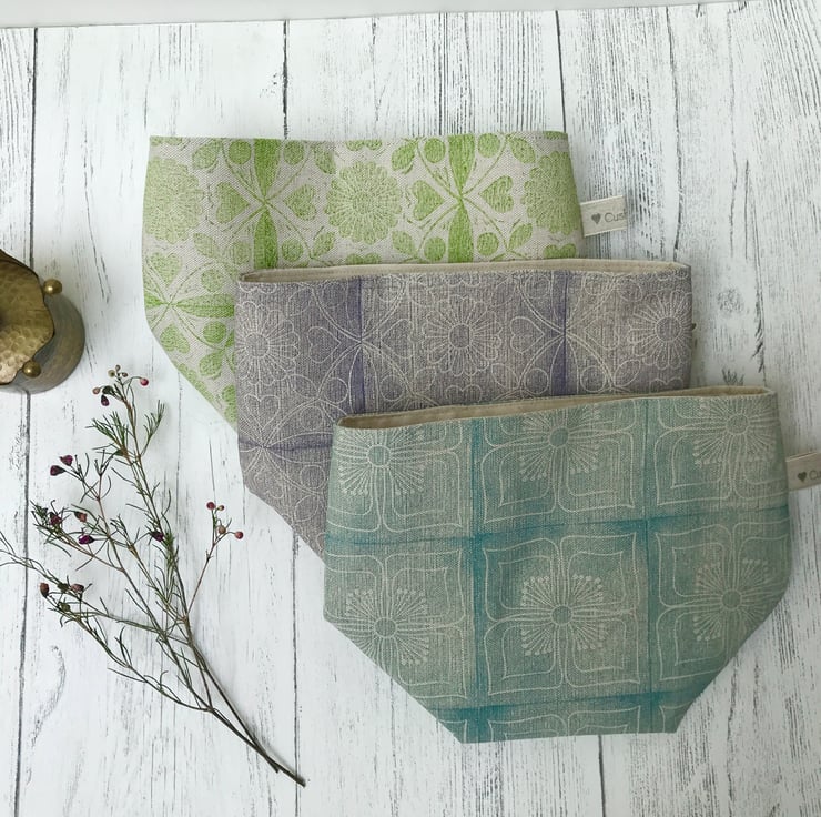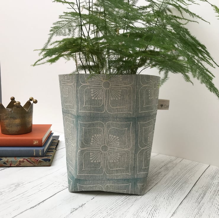 This unique design is block printed by hand using Eco-Friendly inks on to natural linen union fabric woven in Scotland. The lining is 100% cotton calico. The top can be folded down or left standing up for more storage