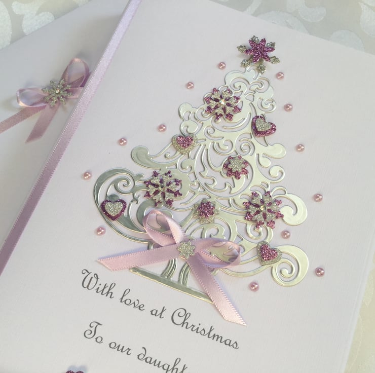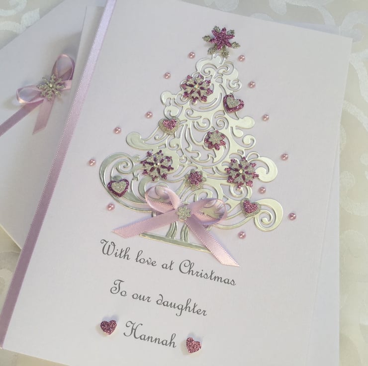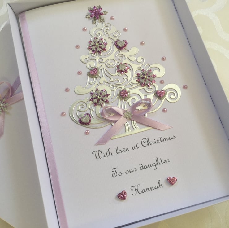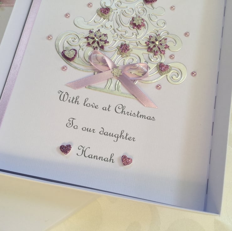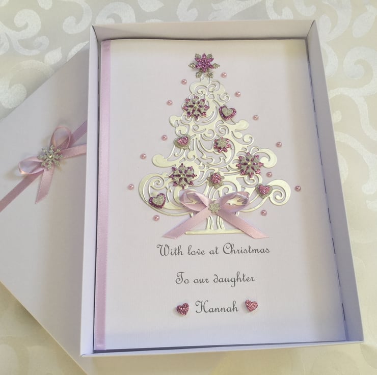 This handmade personalised Christmas card is A5 in size ( 210mm x 150mm) and is on 300gsm heavyweight linen card. The card can be for an individual or a couple and the text underneath the tree can be personalised for you.