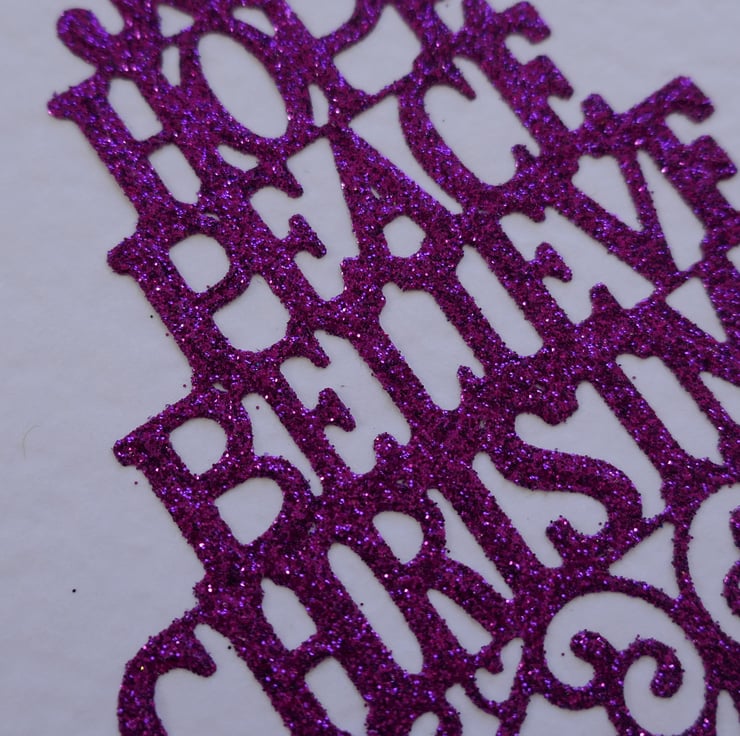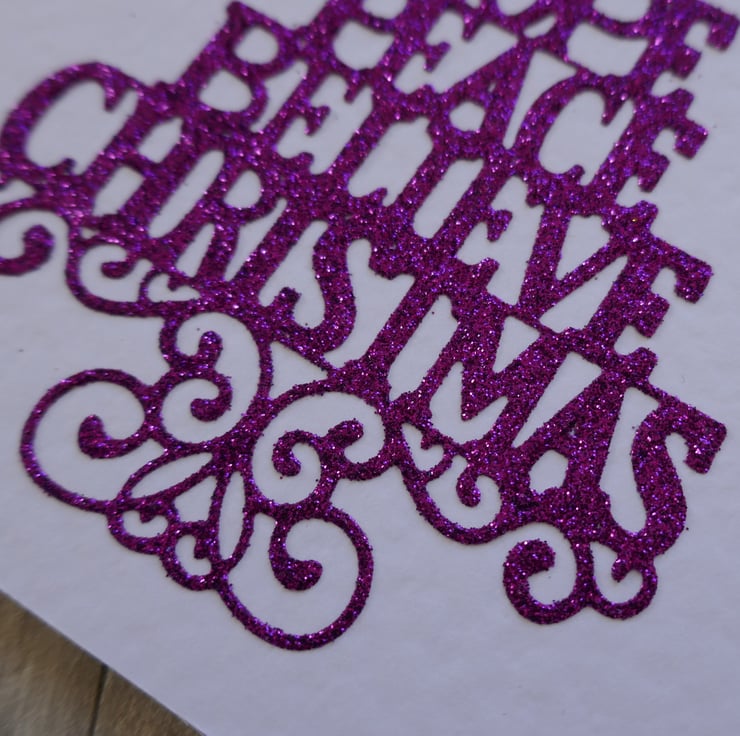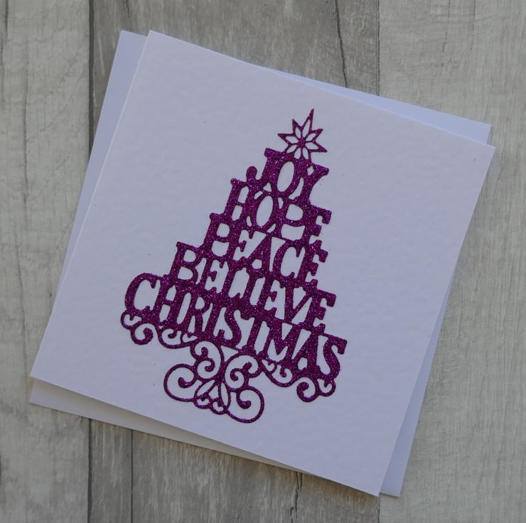 The Christmas tree has been die cut from purple glitter card and attached to the centre.