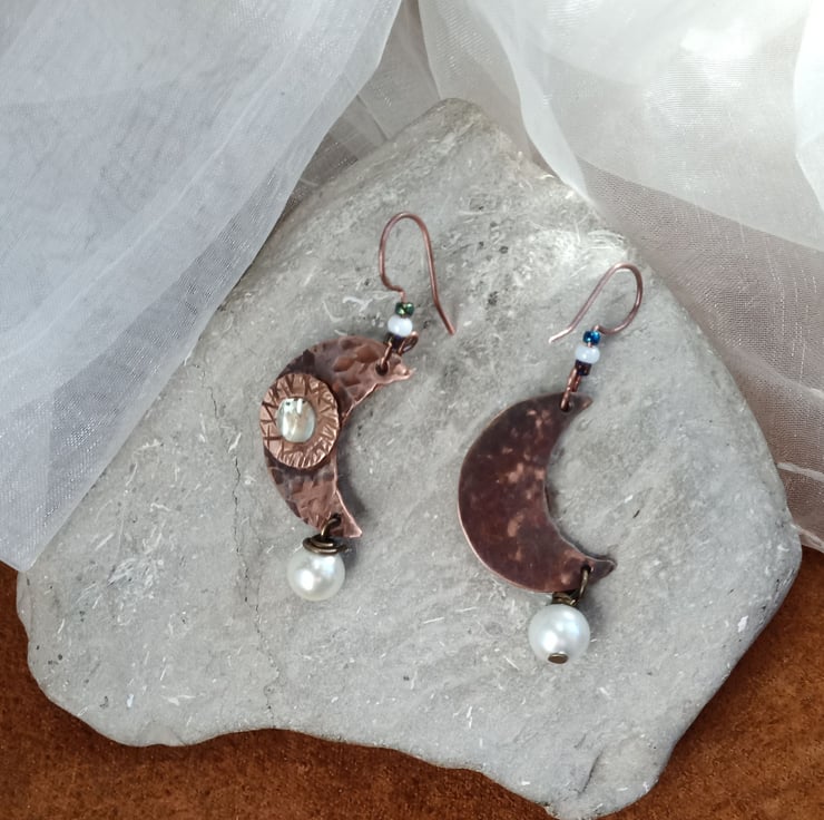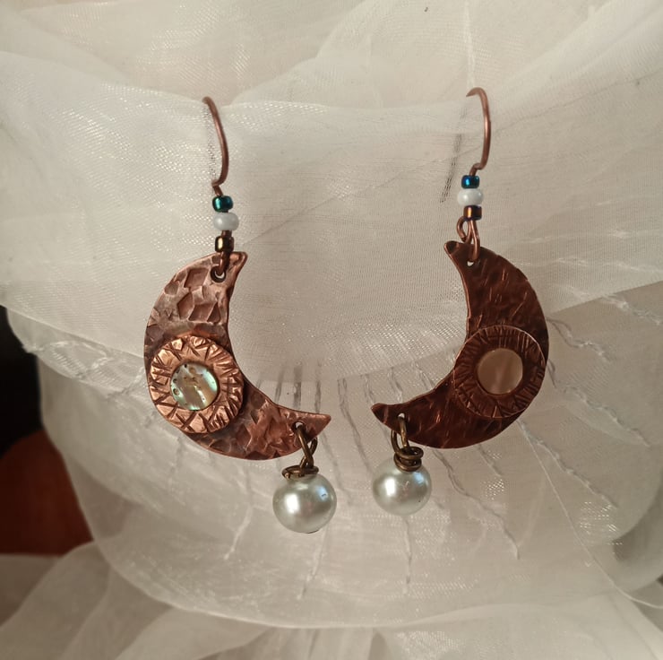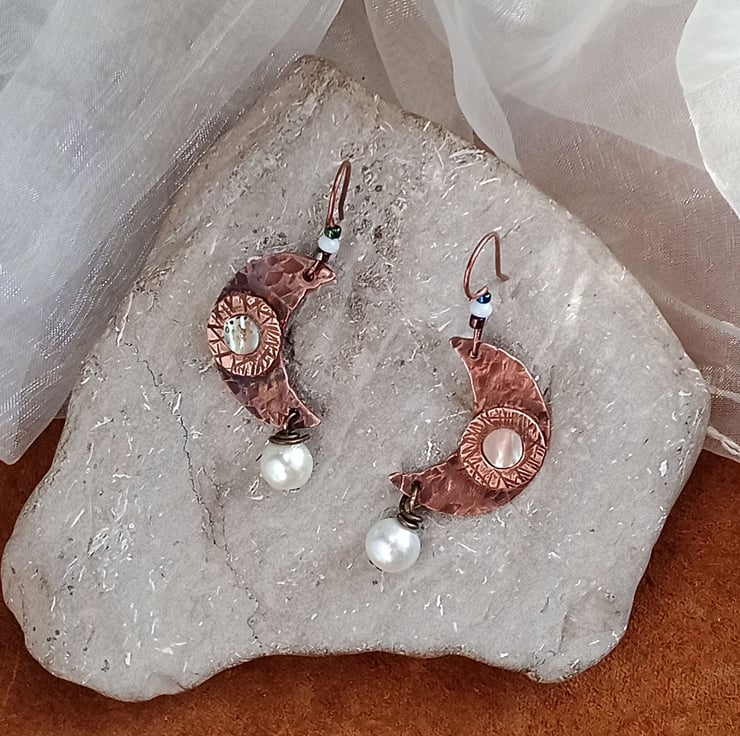 They are made from repurposed copper plate and have been cut, shaped and hammered to add texture with soldered copper washers holding small polished circles of mother of pearl to give them luminescence. A wire wrapped pearl bead dangle completes the design and adds a shimmering effect.