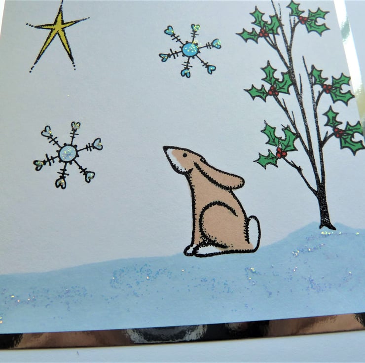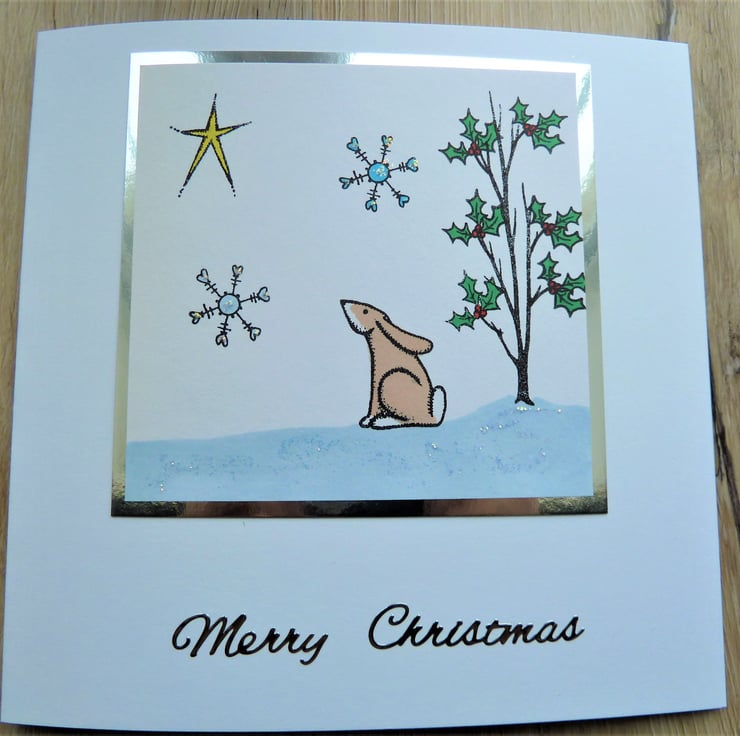 A handmade card which has been stamped with the image of a winter woodland hare, it features added glitter to give a little sparkle. The image has been hand coloured and the words 'Merry Christmas' are underneath.