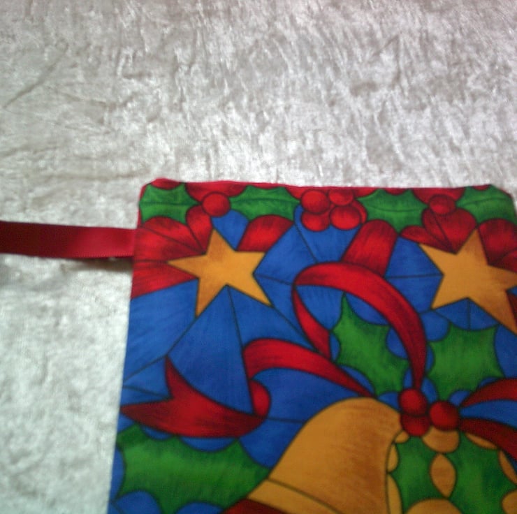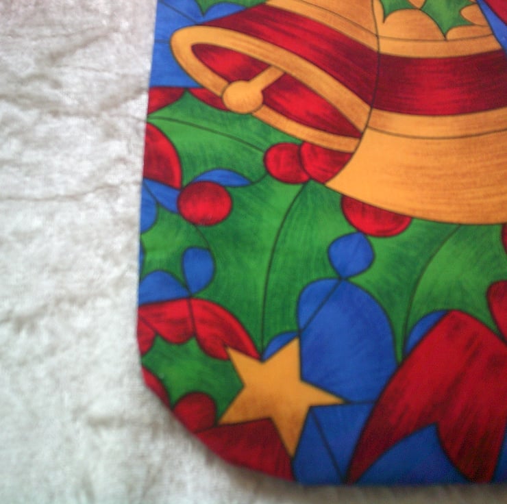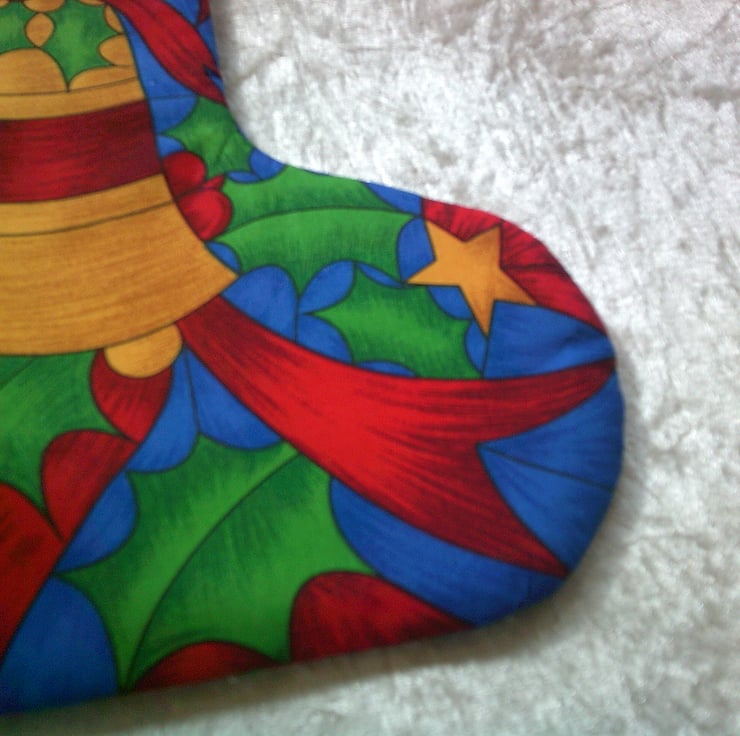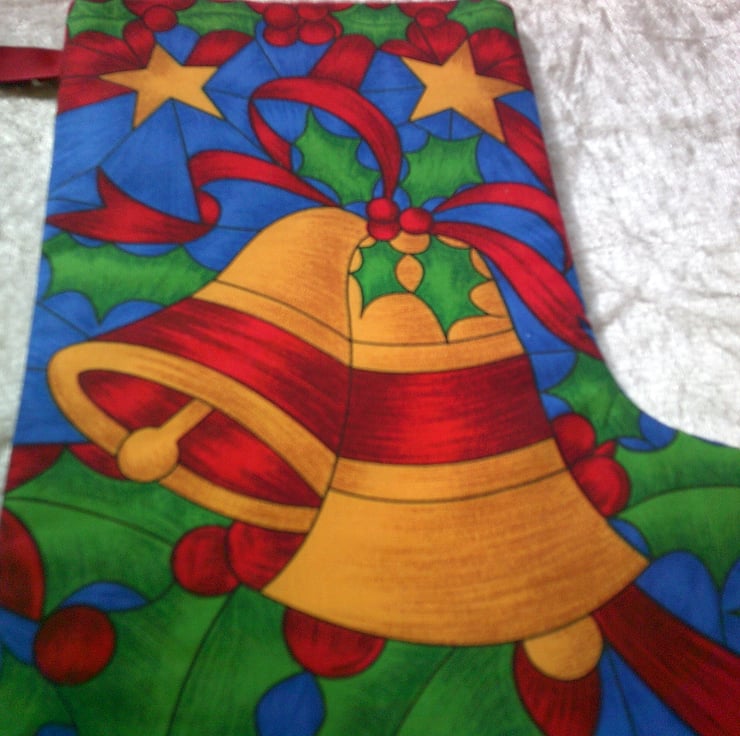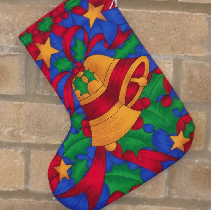 This Christmas Stocking features a Stained Glass style design of Bells and Holly in bright red, green, blue and yellow. The design is the same on both sides so it can be hung up either way round and either be used for small gifts or just as a decoration. It could also be used to hold a Secret Santa Gift.