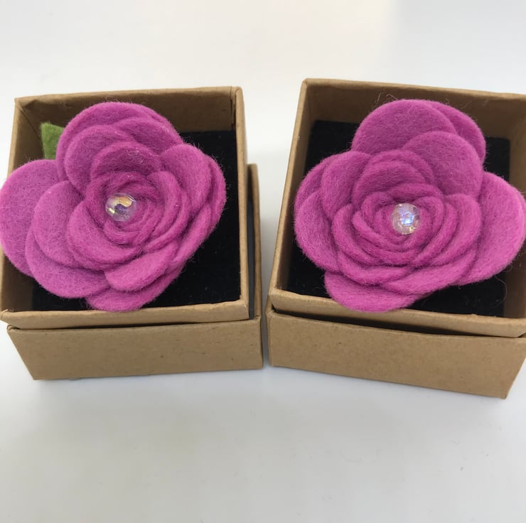 A Rose pink flower felt brooch set in a round metal brooch back. This one has a diamante set in the centre of the flower to give a little sparkle.