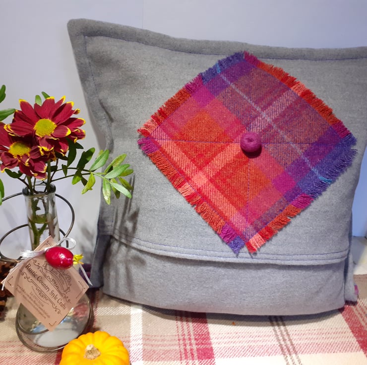 Made using Harris Tweed and Wool Felt this cushion cover with a cross design of reds and blue on the front with a fray edged diamond shape detail secured with a felt bead on the reserve with an envelope closure for ease of inserting the cushion (not supplied). DRY CLEAN ONLY.