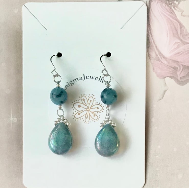 These lovely earrings are beaded with a Czech glass drop bead & tiny sterling silver beads - dangling from a gorgeous semi-precious frosted agate bead - just stunning!