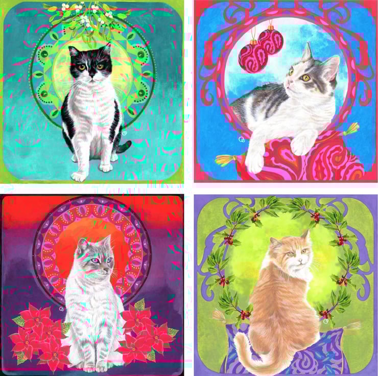 This is a collection of four Art Nouveau cats, each picture is from an original watercolour and gouache painting with digital additions of Christmas elements, also created from original watercolour and gouache paintings. The images have been printed onto quality matte photo paper which I have hand cut carefully and applied onto quality white cardstock for a handmade finish.