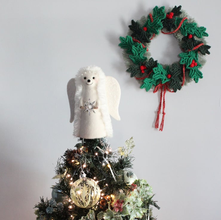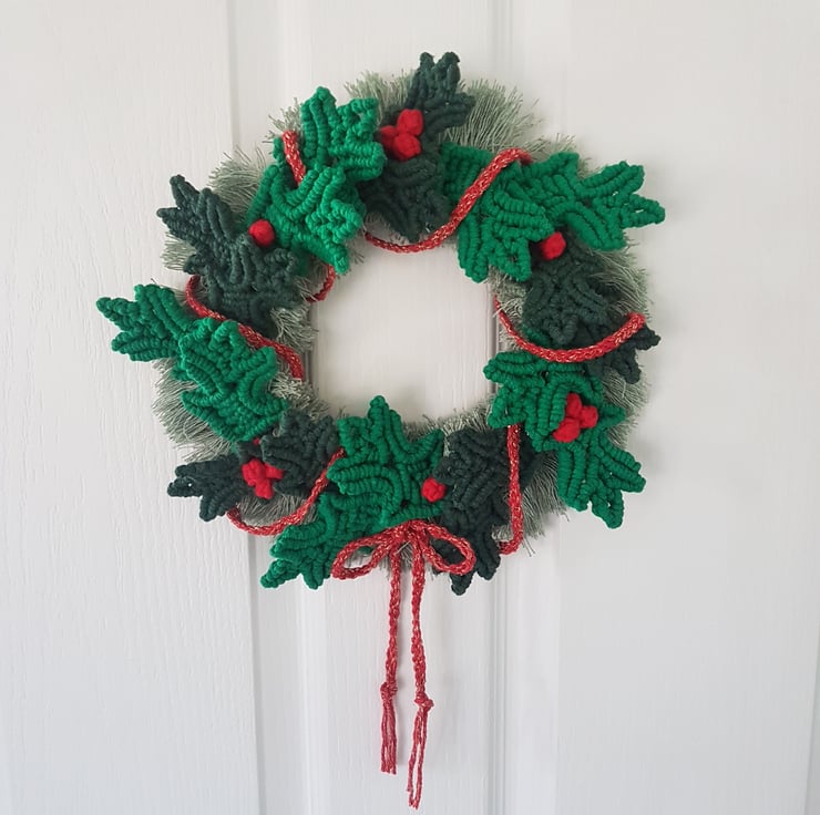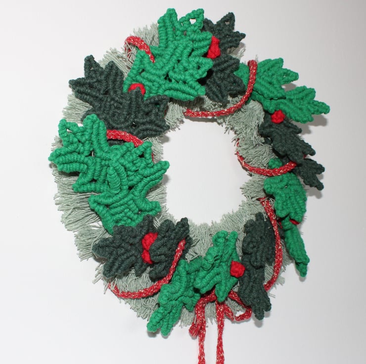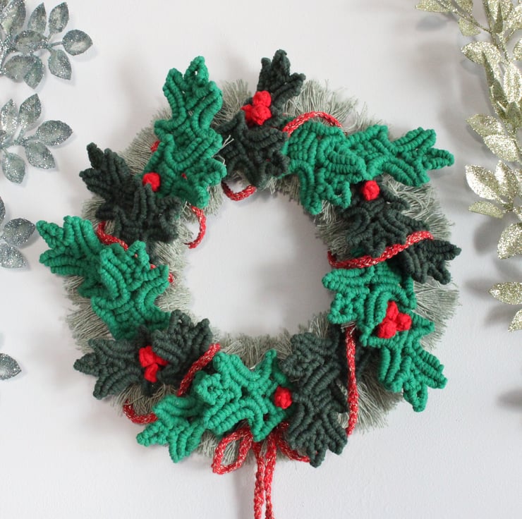 The bamboo ring has been wrapped in Christmas green cotton twine. Over this has been tied individual cords of pale green brushed and fanned out to represent fir sprigs. Each holly leaf and berry has been knotted by hand and tied around the ring. Finally a red and gold braid has been wrapped through the holly leaves and tied at the bottom. The overall effect is simply stunning