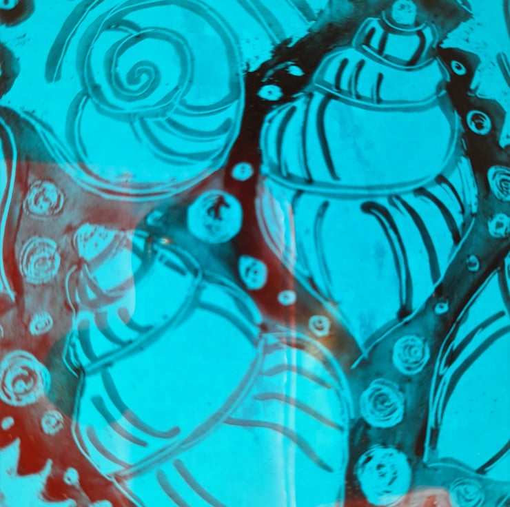 This piece is a one off piece of glass art. I begin by painting the whole piece of glass with enamel and then I scratch the glass away to reveal the glass below.