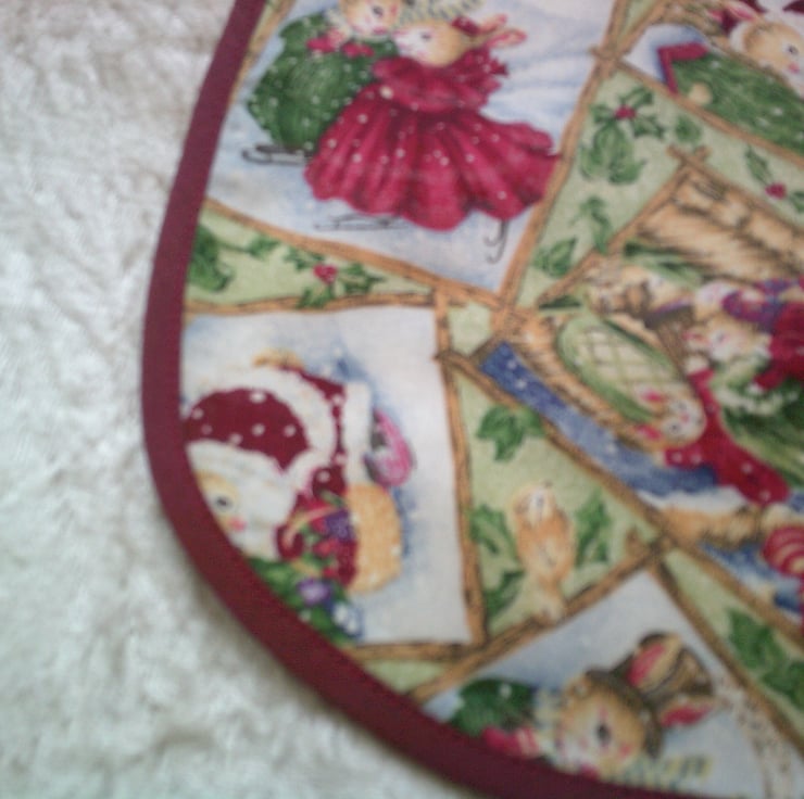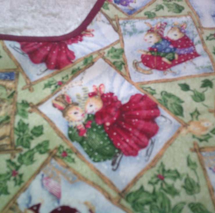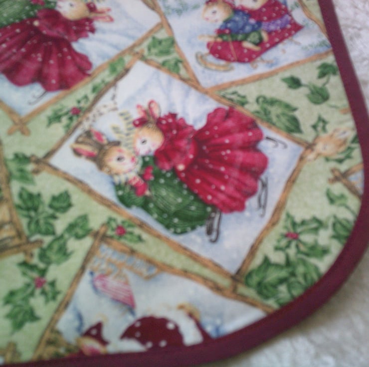 The design is of dressed up Rabbits in the Snow going out visiting.