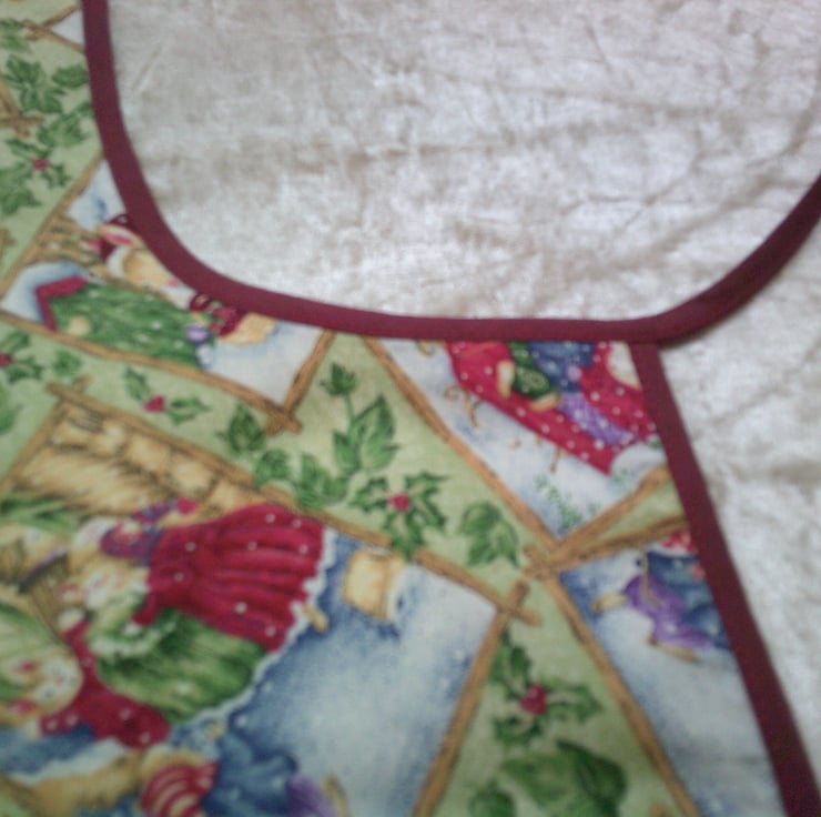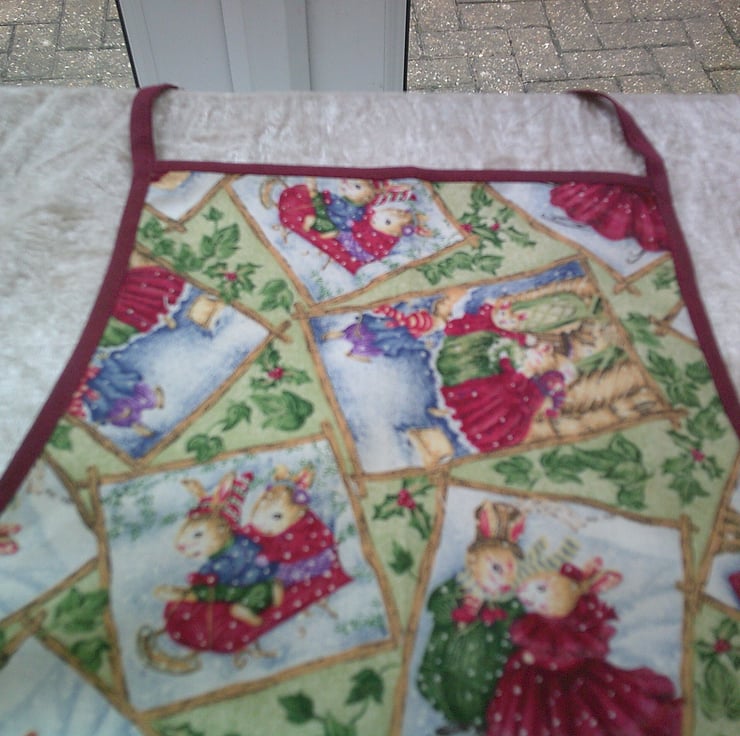 This Christmas apron is suitable for a child / baby of 1-3 years of age. It measures approximately 16 inches (40 cm) at the waist and 17 inches (43 cm) from the top of the bib part to the bottom - excluding the neck strap.