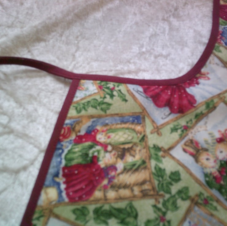 The straps are made using bias binding which is also used for edging the apron. If the neck strap is a bit too long it can be tied to shorten.