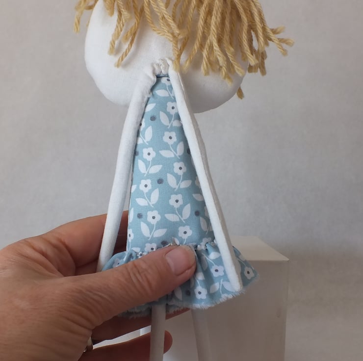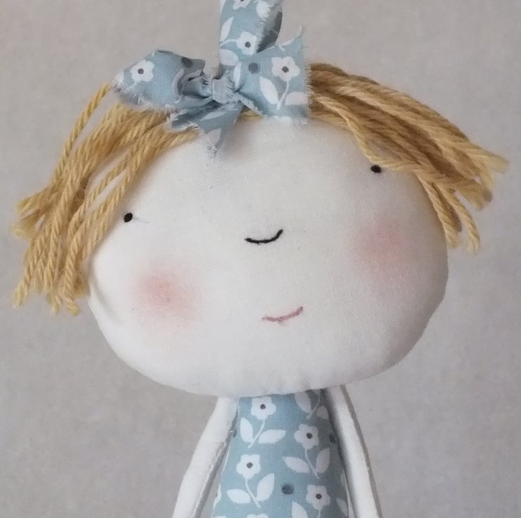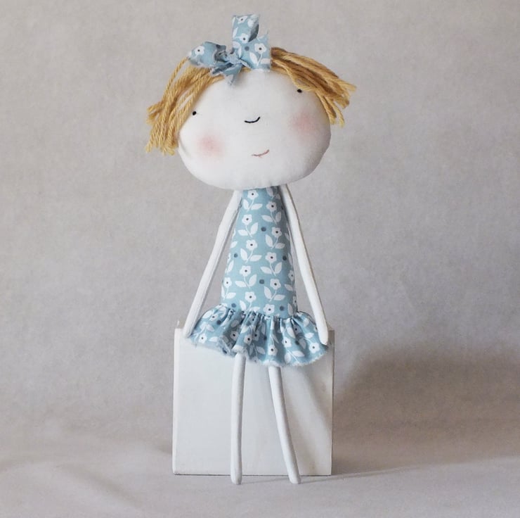Girl is made from white cotton fabric. She has an embroidered face and alpaca yarn hair. She has a pretty blue and white cotton dress. She also has wired arms and legs so that you can gently re- position them.