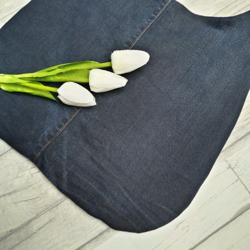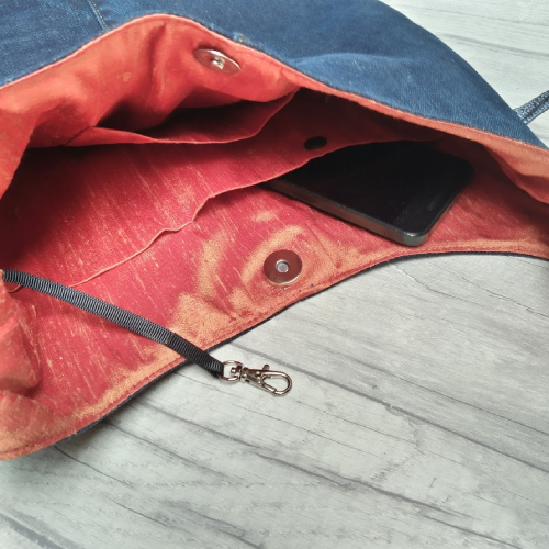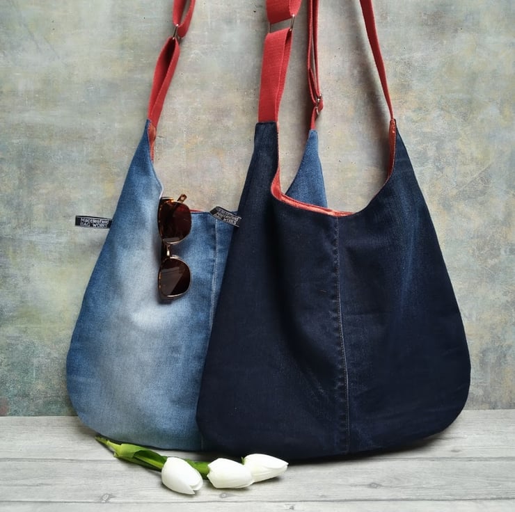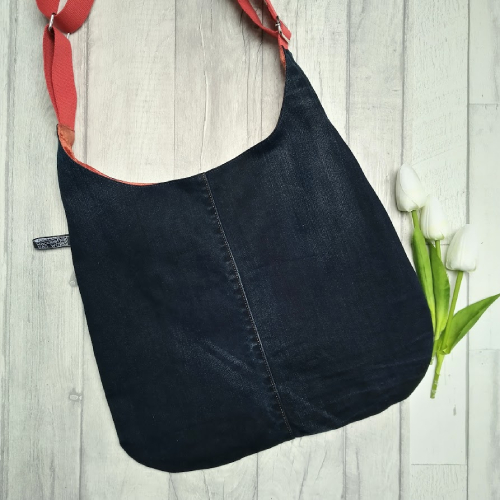 Boho and beautiful, this repurposed denim hobo bag has been handmade using repurposed dark blue denim and lined with a gorgeous russet coloured silk lining. A russet shoulder or cross body strap strap fits comfortably over the shoulder and perfectly compliment the lining for a fantastic pop of colour. Choose length of strap from drop down options.