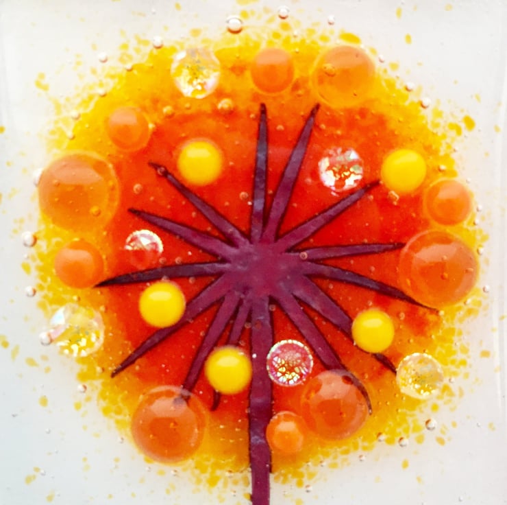 To make this fused glass hanging, I hand cut copper foil with a scalpel to make the alliums and the letters and carefully arranged them on transparent art glass. I then stencil powdered glass and cap it with another piece of art glass. I then fuse it overnight slowly in my kiln. I then add coloured and dichroic dots which I have made previously to give some added interest to the design. A second firing is done overnight the next day to tack fuse the dots onto the design, so that they stand proud of the glass, giving it a 3D effect.