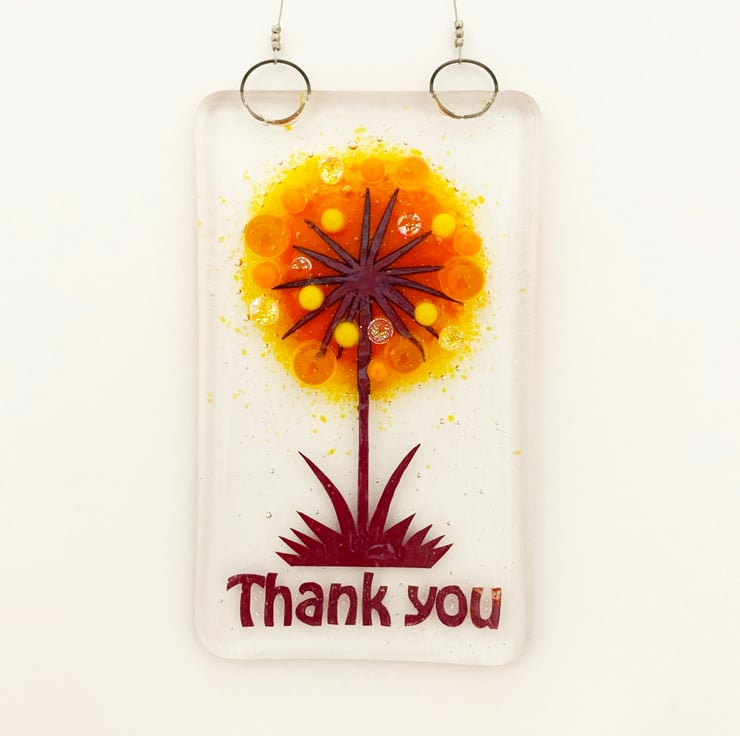 Fused glass hanging allium suncatcher, in Summery shades of orange and yellow, featuring handcut copper foil alliums and the words "thank you." This would make a beautiful gift for a special friend and looks lovely in a window. Please note, I can make these to order to include a name, just contact me and ask.